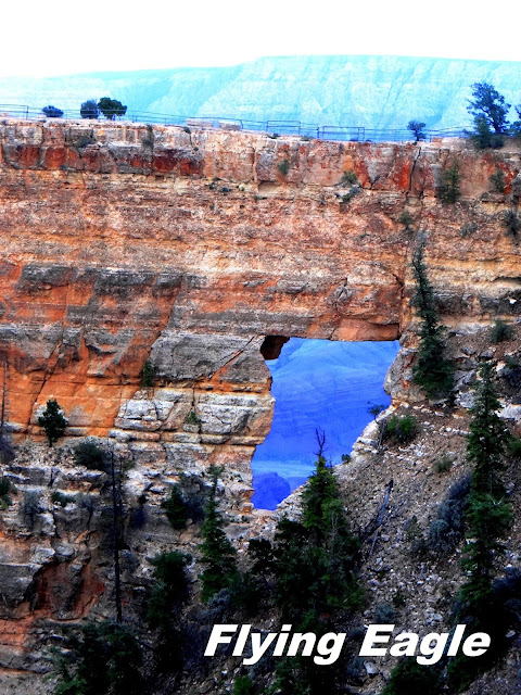 接著前往皇家角步道(Cape Royal Trail),這是來到北緣不可錯過的一條步道,來回需約半小時。沒走多久就遠遠看到山崖上有個大洞,那是天使之窗(Angels Window),但一直到步道將盡才走到近處,把這窗口仔細端詳一番。原來這窗口還有玄機,從窗子望出去可以看到科羅拉多河。窗口旁的山壁還長了為數不少的樹木,生命力實在不容小覷!步道盡頭有沃坦的寶座(Wotans Throne)和其他景觀,沃坦是北歐神話故事裡的神祇,可能取名字的人看到眾山環抱,狀似王的寶座吧!