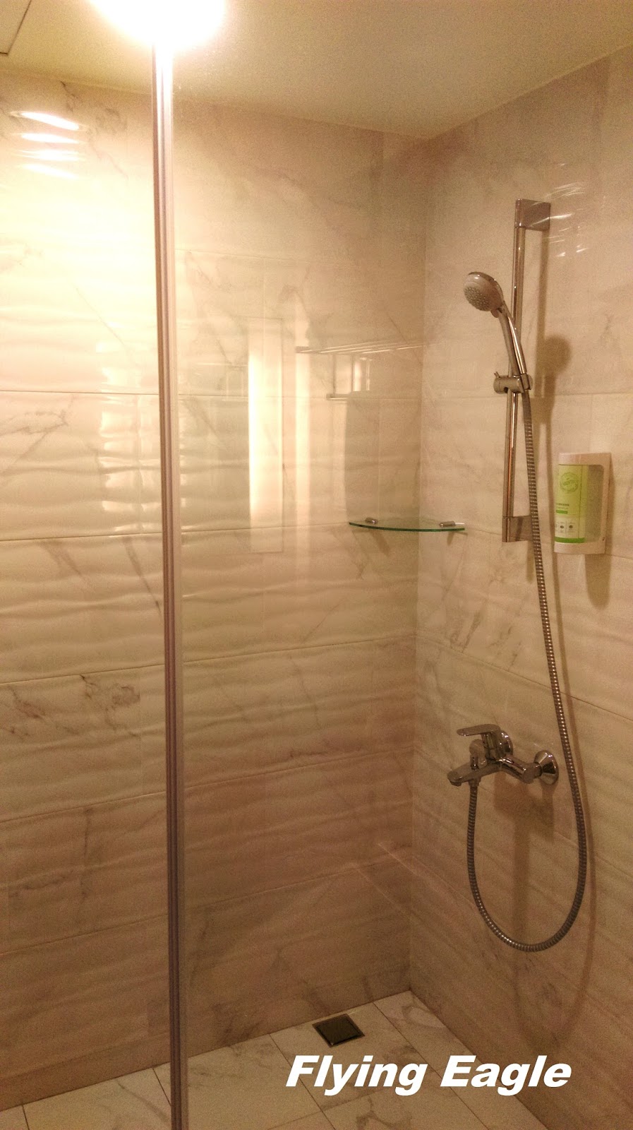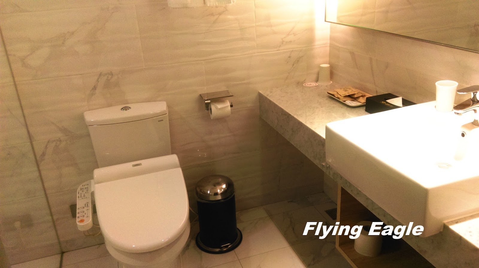 我們訂的是禁煙尊榮客房,一進房間就聞到濃濃的煙味。向櫃檯反應,他們立即替我們換房,效率很高。新的房間仍有些微煙味,不禁感慨不守規矩的人真不少!房間的格局方正,比我們近年回台北住的略大,放置行李後仍有很多活動空間。房間採光和照明都不錯,拉上窗簾也蠻明亮,不會黑漆漆的。浴室很寬敞,洗臉盆旁有很多空位可以擺放盥洗用品。我們房間沒有浴缸,只有淋浴,簡單俐落,正合我心。洗髮精兼沐浴乳就架在牆上,沒有提供潤絲精和護膚乳液是個小缺憾,髮質和皮膚乾的人要自備。