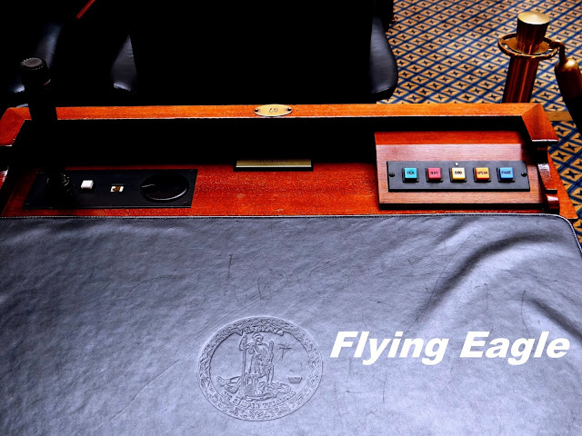 ▲現今使用的州眾議會。 ▲議員的桌墊上都有著州徽,猜猜5個按鈕各有何功用?
