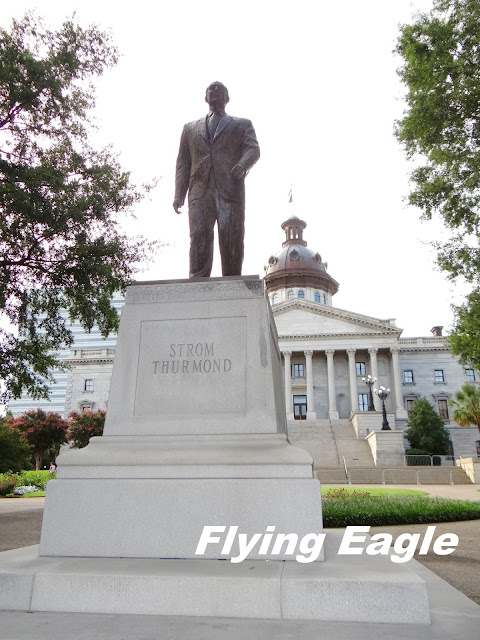 州府的周邊有近30座紀念碑和雕像,數目之多令人咋舌。其中有的是為紀念對南卡或對美國有所貢獻的人物,有的是緬懷歷史事件。我對瑟蒙(Strom Thurmond,1902 – 2003)仍有印象,他是南卡著名的政治人物,曾擔任州長和國會參議員。大概很少有其他政治人物能和瑟蒙媲美,他任參議員長達48年,直到成為百歲人瑞才退休。另外值得一提的是非裔紀念碑(African-American Monument),它記錄了非裔從非洲搭乘奴隸船到達南卡的血淚史。