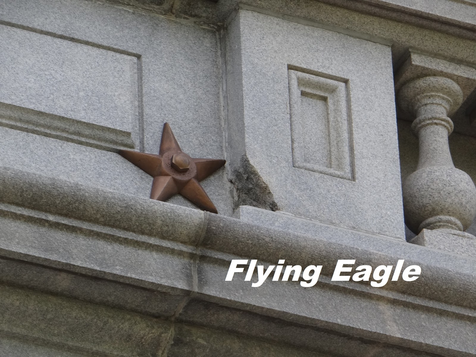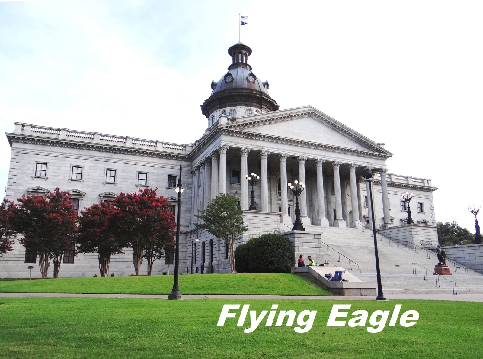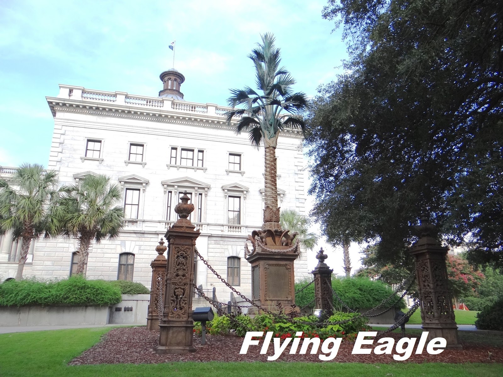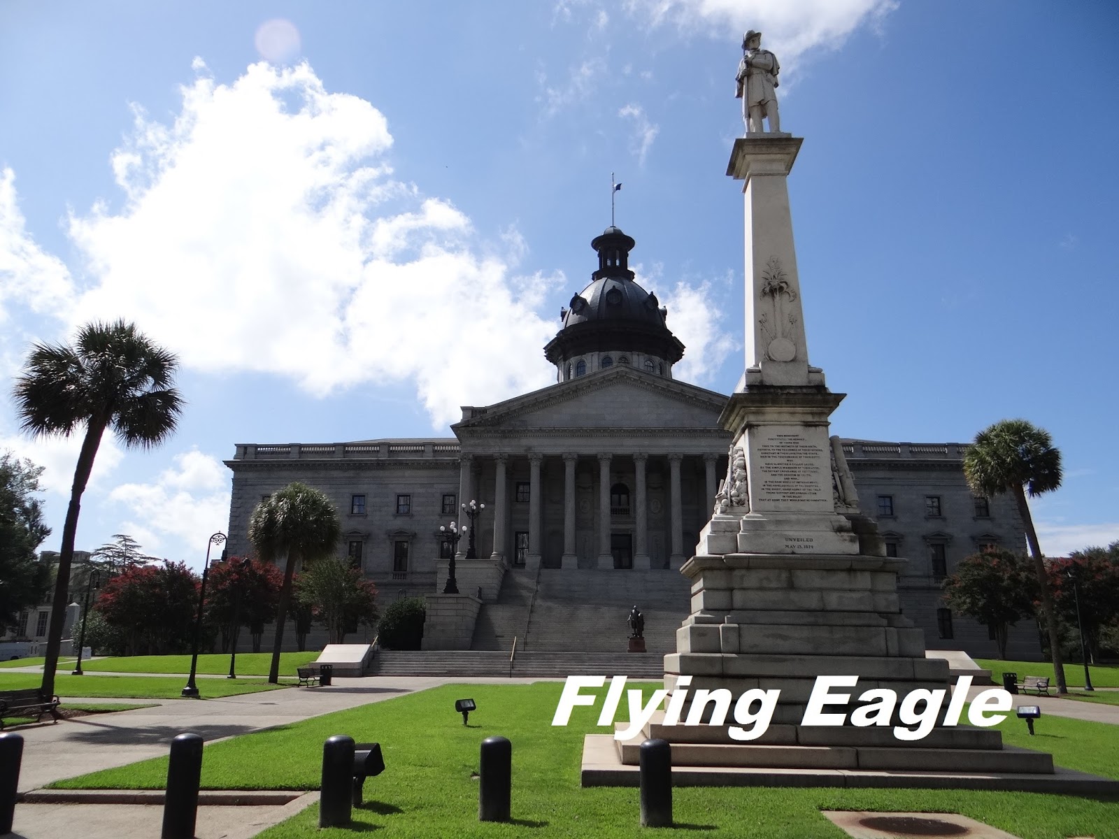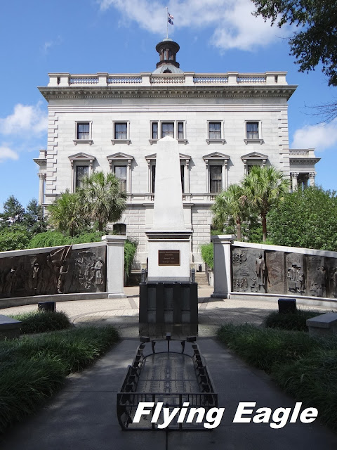 南卡的州府和多數的州府一樣,採圓頂造型。但這個州府的命運多舛,從1855年開始建造,一直到1907年才竣工。興建工程因南北戰爭而延宕,而當薛曼將軍(General W.T. Sherman)麾下的北軍進城後,工程更是完全停擺。北軍實施焦土政策,將不少公共建築付之一炬,州府也未能倖免於難,受到砲彈的攻擊。迄今州府外牆仍特意保留著砲彈造成的毀損,並用銅製星星標示出來,一共有6處。這是我們走訪過的40餘座州府中,絕無僅有的。此外,州府前華盛頓銅像的拐杖短了一截,根據銅像底座上的說明,這也是北軍破壞的,不過有些史家有不同看法。