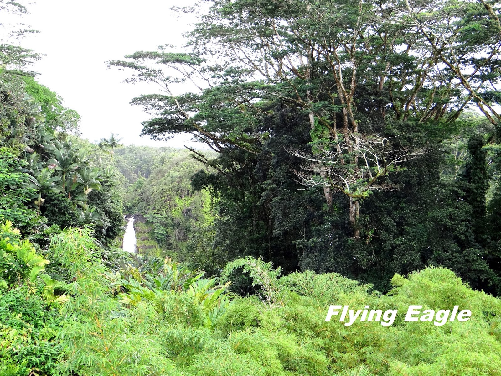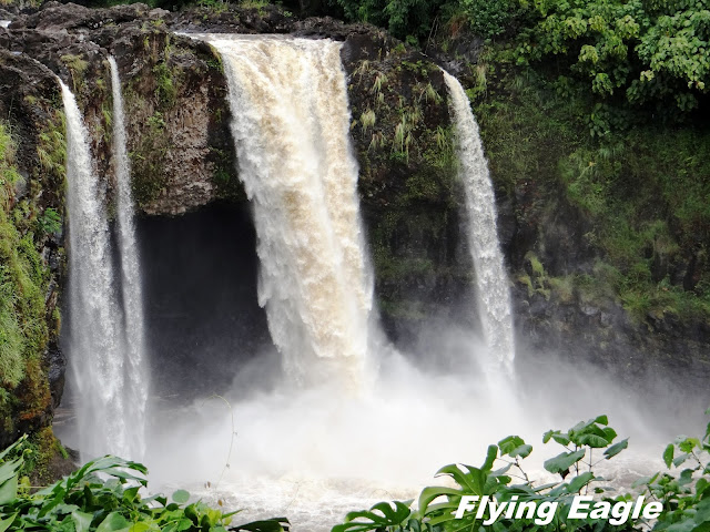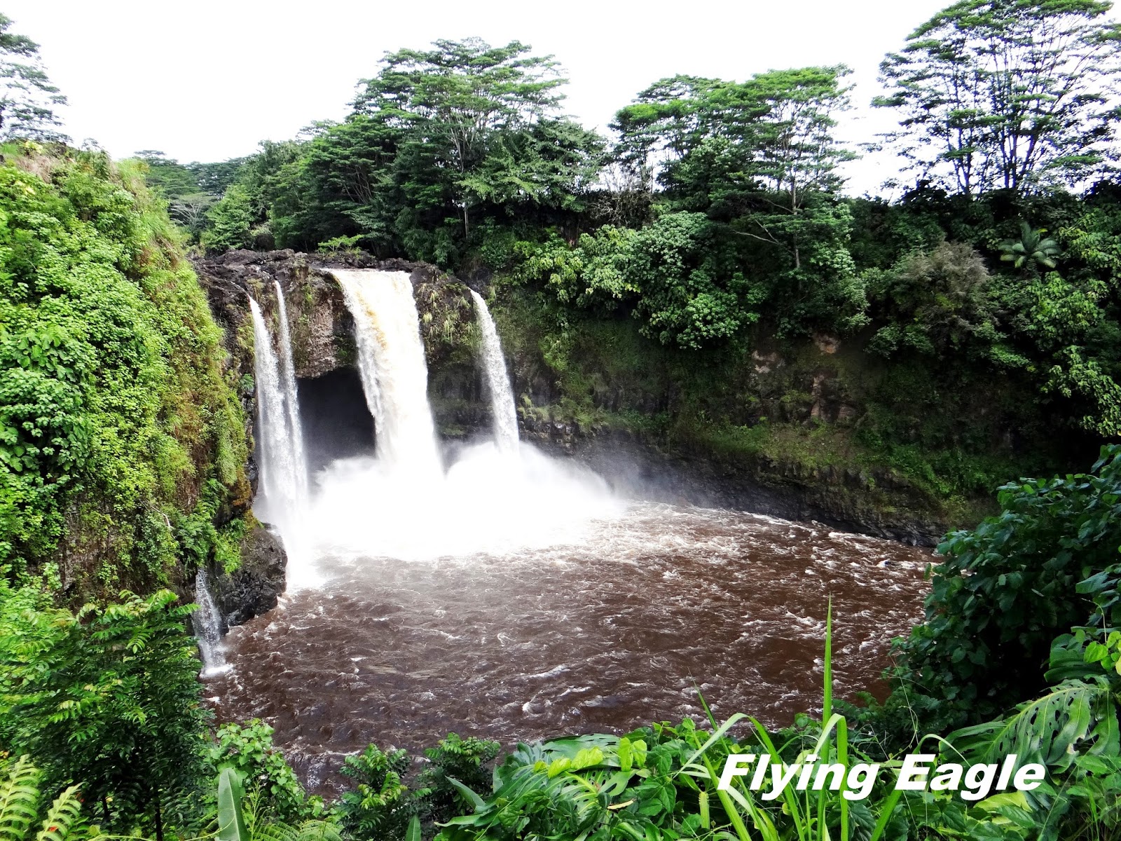 彩虹瀑布 (Rainbow Falls)在威陸庫州立公園(Wailuku River State Park)內,而公園則位於大島東部。據說彩虹瀑布 (Rainbow Falls)在有陽光的早晨常出現彩虹,因而得名。我們抵達時正是早上又有陽光,卻不見彩虹的蹤影。公園內有另一個瀑布名為Peepee,若看英文會覺得應該是水量很小,有如小朋友尿尿,但其實當地語言的發音是佩雅佩雅。觀看佩雅佩雅瀑布的觀景台也同時可看到煮沸鍋 (Boiling Pots)的景致。威陸庫河流經河床裡一個個中空的熔岩結構,看來就像煮沸的水從鍋中流瀉一般。