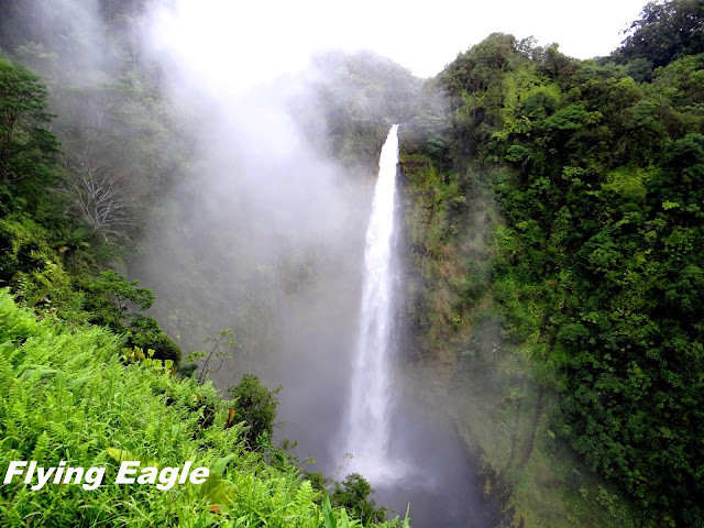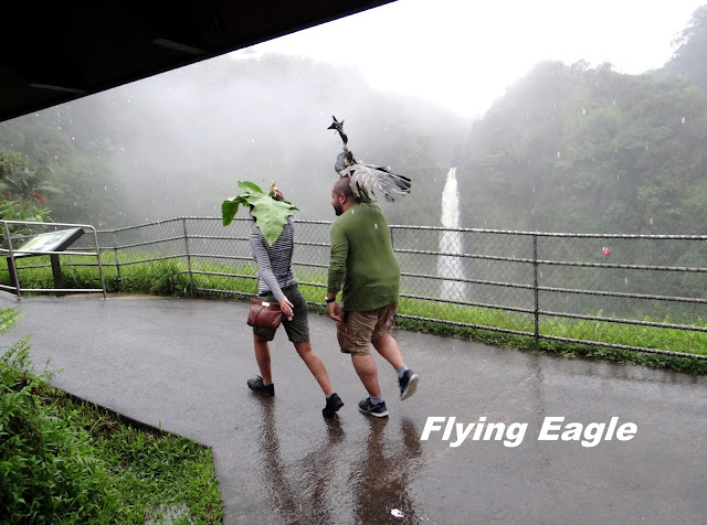 阿卡卡州立公園(Akaka State Park)位於大島的東北部,公園裡除了阿卡卡瀑布(Akaka Falls)外還有卡胡納瀑布(Kahuna Falls),但以前者較為出名。通往瀑布的環形步道位於停車場旁,十分方便。我們到訪時陰雨綿綿,但公園管理員就冒雨站在步道起點按人頭收費,好像生恐遊客溜了進去。步道全長0.4哩,約半小時可以走完,沿路都是雨林、竹林和蕨類植物景觀。我們抵達阿卡卡瀑布時雨越下越大,好在旁邊有座棚子可以躲雨。此時有2位以葉子當傘的遊客經過,模樣甚是逗趣。棚下避雨人不約而同一陣大笑,而這2人亦不以為忤,對大家微笑揮手。