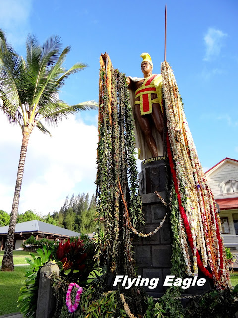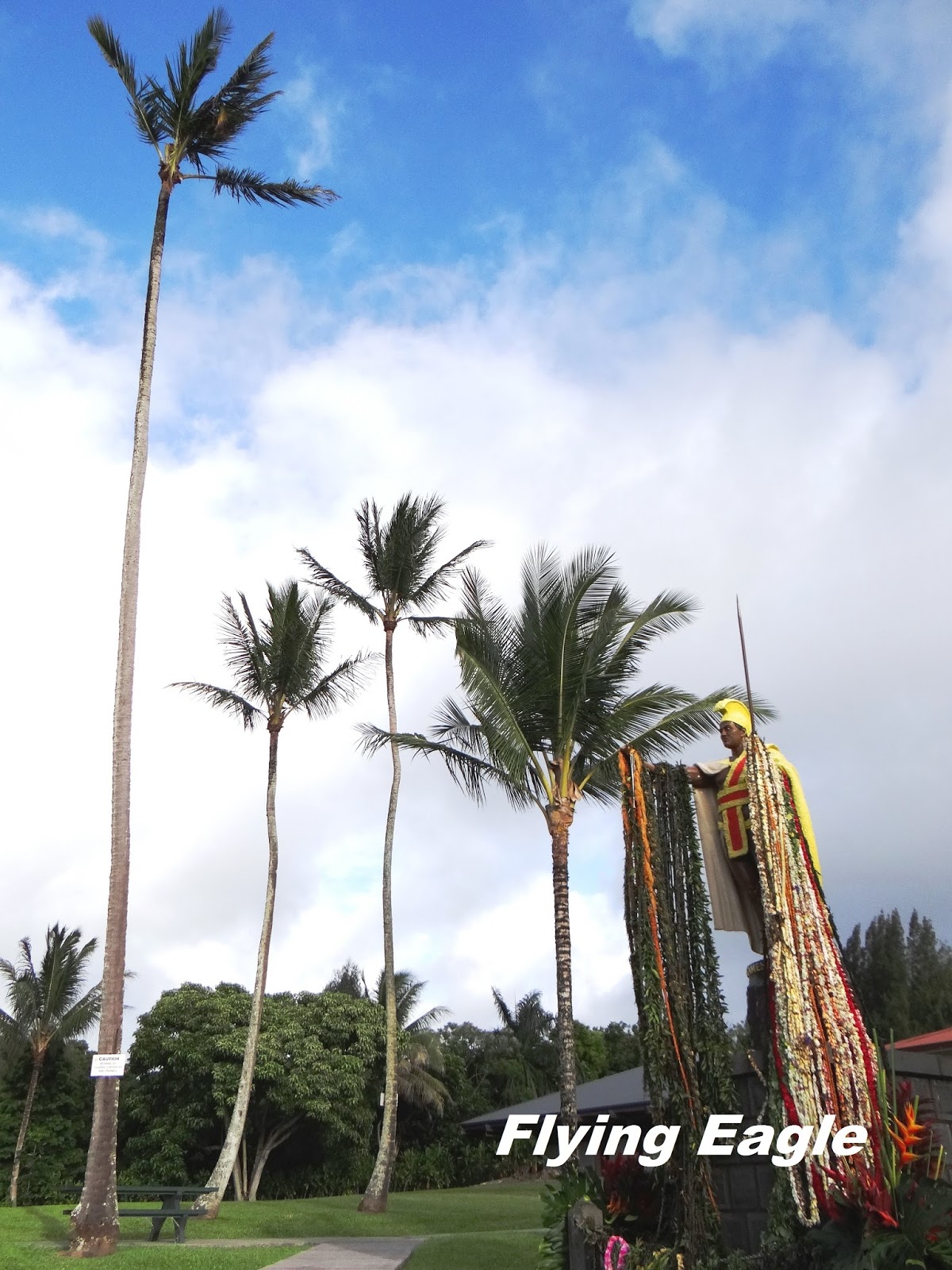 另一處有君王圖像標示的景點是卡美哈梅哈一世(Kamehameha I)的雕像,卡美哈梅哈一世原是大島的酋長,經過多年征戰統一各部族,開創了夏威夷王國。此雕像後面的房子據說是卡美哈梅哈一世的誕生處,而雕像的複製品現矗立於檀香山的夏威夷最高法院前。有趣的是旁邊的樹上掛有警示,叫人提防墜落的椰子和樹葉。仰頭一看,的確若椰子從那麼高的樹上墜下,重力加速度還真不得了!