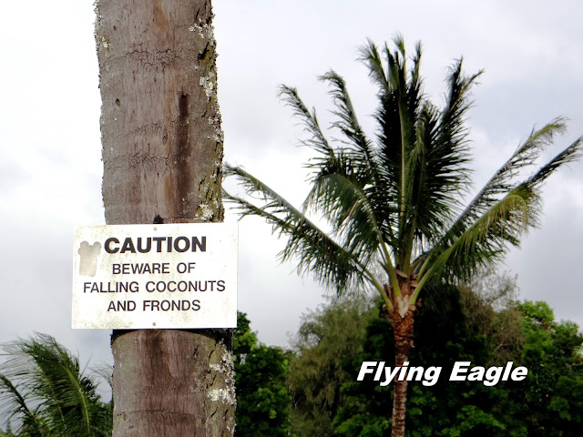 ▲最左邊的樹上掛有警示牌,椰子砸下來可真不得了!