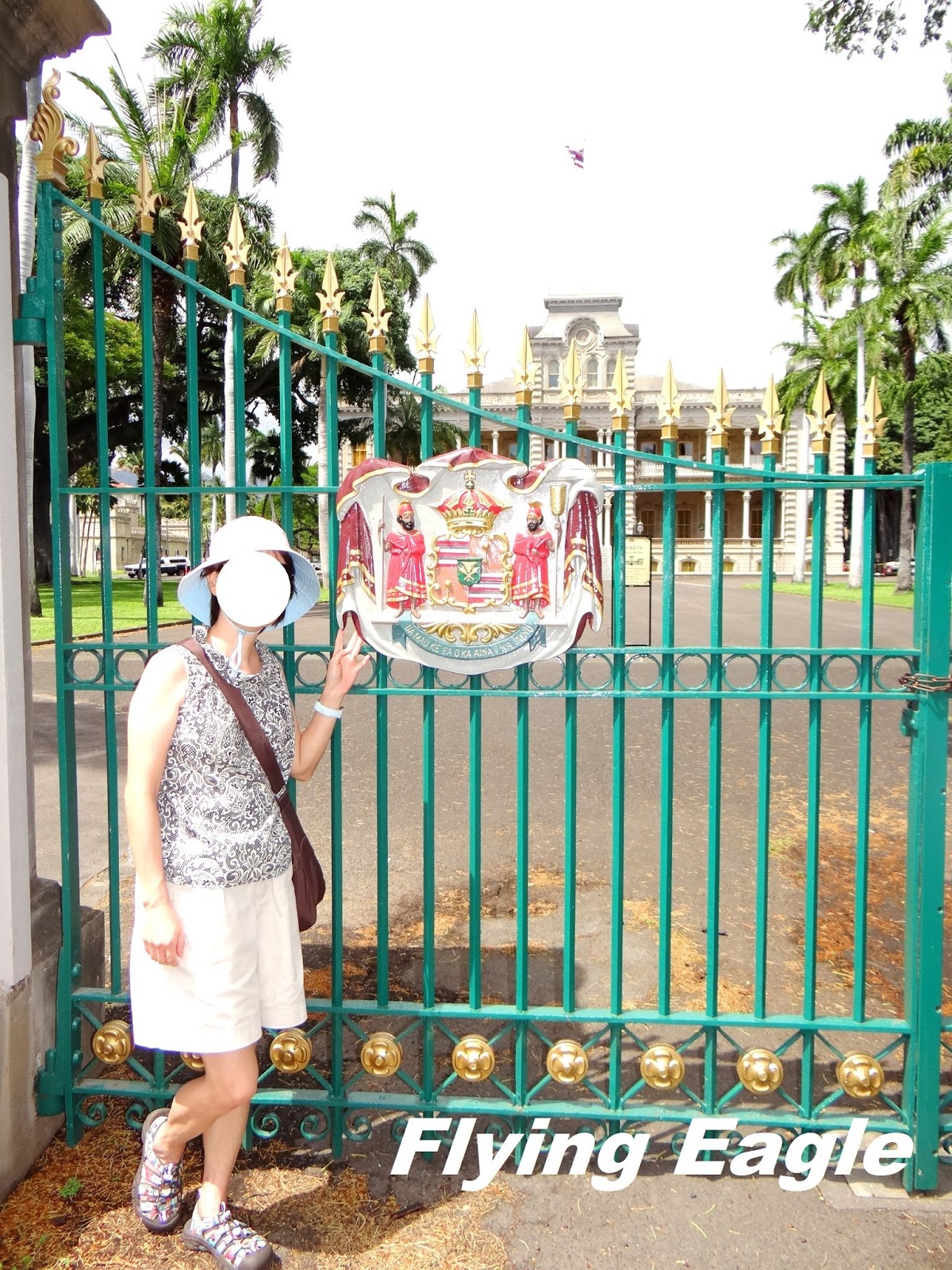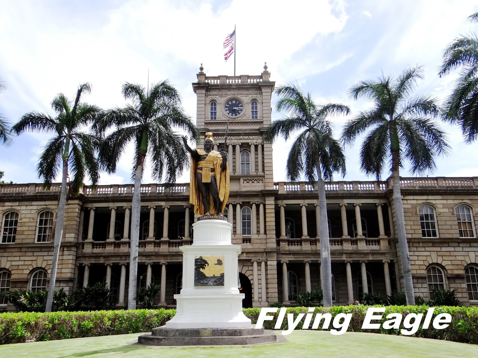 既然來到檀香山市區,就順道前往伊奧拉尼宮(ʻIolani Palace)。這是美國本土唯一的皇宮,興建於1879年,因為極具歷史價值,被列在美國國家史蹟名錄(National Register of Historic Places) 。皇宮對面是Aliʻiōlani Hale,即前夏威夷王國的政府所在,如今是該州最高法院。門前廣場高聳的是卡美哈梅哈一世(Kamehameha I)的雕像,他本是大島的酋長,後來開創了夏威夷王國。我們在大島時,曾看過雕像的原版。