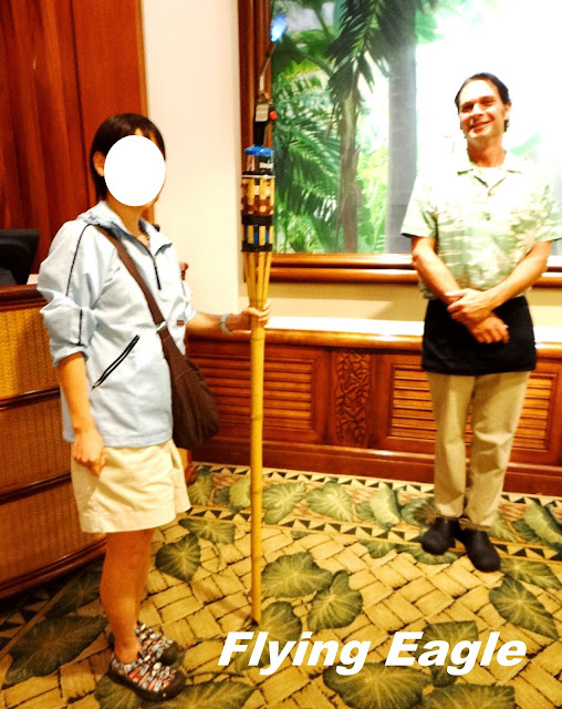 我們在夏威夷之行中品嘗了不同的餐點,最美味的一餐是在Hula Grill吃的,這家餐廳位於Outrigger Waikiki Beach Resort,可以欣賞到日落時的沙灘景致。天色漸暗時戶外點起了火把,而有些火把的位置很難搆得到。服務人員在我們詢問下,隨即拿來了點火的工具當場操作,滿足了我們的好奇心。