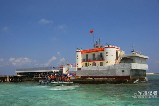 11/11/23 南薰礁,位于郑和群礁西端,由两个相距2.5海里的礁盘组成,低潮时会露出数十块礁石,渔民俗称这里为“南乙峙仔”。南薰礁的永固式礁堡这座上世纪九十年代初期修建的建筑,虽然已经历经二十年风雨洗礼,却看不出一点陈旧感。宿舍里宽大的双层实木床和空调大大提升了官兵们休息质量;卫星电视可以收看70多个国内频道。去年新安装大功率柴油机组,彻底解除了以往限时供电带来的苦恼。雨水收集系统和海水淡化系统的相继建成,让以往限量用水时的必不可少的水桶失去了用武之地。2008年海军蓝网在南海各礁落户,从此官兵们可以及时了解国内外资讯;今年上半年,南沙各礁覆盖移动通信业务,官兵们随时都可以和亲人们通上电话,南沙礁盘再也不是以往的“信息孤岛”。