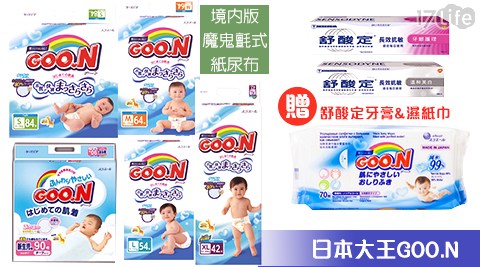 17life團購熱銷推薦→日本大王GOO.N-境內版黏貼式紙尿布購買再加贈舒酸定牙膏1入(120g/入)+大王濕紙巾1包(70抽/包)