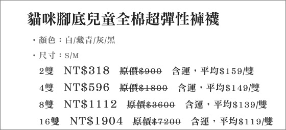 整理資訊大致有分享文、開箱文、試用文、評鑑文、推薦文、是否便宜、優缺點等資訊.PHOEBE不吝嗇分享他的生活點點滴滴;包括網路上購買的任何東西.我有去遍尋各大購物網站momo購物、yahoo奇摩購物、博客來、PChome線上購物、ibon mart搜尋優惠價格!google找一下有些人再熱烈討論貓咪腳底兒童全棉超彈性褲襪.貓咪腳底兒童全棉超彈性褲襪數量有限,售完為止!限量是殘酷的,不要猶豫入手要快~ |