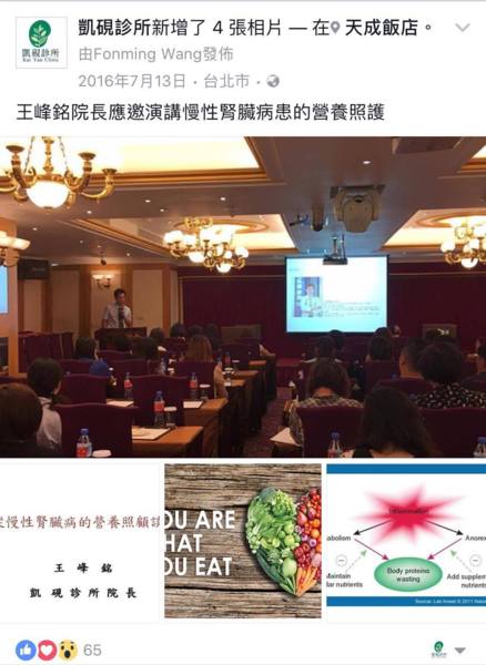 天母 凱硯診所王峰銘醫師 王峰銘院長應邀演講慢性腎臟病患的營養照護