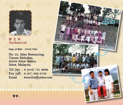請同學們快寄照片來,一張個人近照,三張生活照(兩張亦可),並附上個人通訊資料(中英文姓名、地址、電話、email.....),我們將把它編到2678大團圓特刊裡,無論是已報名或未報名都可將有關資料寄給特刊主編黃曼錚 nggrace4545@yahoo.com , 016-7194545。