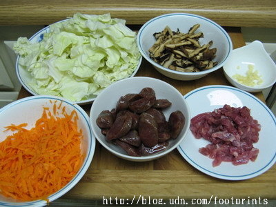 蒜、高麗菜、紅蘿蔔、豬肉、香腸、香菇、麵粉、蛋、水