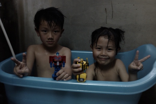 下午小朋友沒有睡覺,所以傍晚時小朋友很容易鬧脾氣(有小朋友的家長們應該都知道 ... 哥哥的眼睛已經變成雙眼皮囉!!)。在小朋友的外婆家泡澡還帶上麥當勞送的變形金剛小玩具入浴。