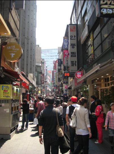跨過大馬路沿著路直走約五六十公尺整塊區域就是明 洞了。