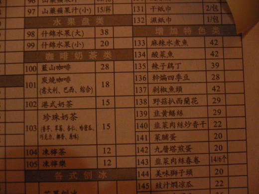 如同在台灣的習慣,我點了一碗油豆腐細粉、一籠小籠包、一碟招牌小菜。看過菜單後,我大概都明白了。小籠包21塊人民幣一籠,換算台幣約100元,這裡一籠是八顆,台北的鼎泰豐一籠110元只有六顆。所以小籠包沒問題,比台北便宜許多,充分反應出兩地物價與消費水平的差異。但蝦仁蛋炒飯22元、肉絲蛋炒飯18元有一點兒貴,元盅土雞麵、元盅牛肉麵小小一碗要38元在當地來算挺貴的,炒豆苗一盤28元人民幣則是離譜!另外,即使是鼎泰豐在大陸竟也不免俗的賣起了「剁椒魚頭」、「麻辣水煮魚」等四川菜色,還賣山藥蘋果汁、藍山咖啡、珍珠奶茶跟凍檸樂(冰的可樂加檸檬)。可能為了強調是台灣來的餐廳,它也賣「台灣鹵肉飯」、「台灣控肉飯」、「三杯雞」、「酥炸花枝」這些東西。這真是一份令人吐血的菜單,我不顧有沒有人會制止,立刻拿出相機把菜單拍了下來,事實上,服務員看到我在拍照他們也不在意。