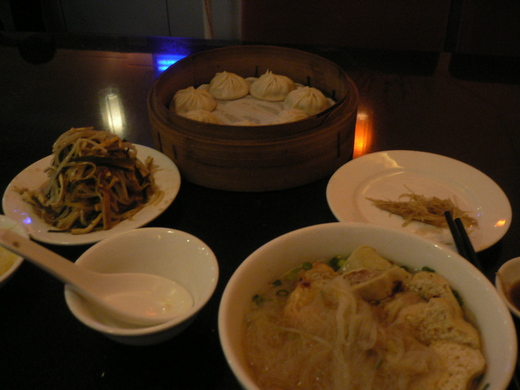 我仔細再找一次,總算在一樓某個隱密的角落找到了它。整個賣場內只有快走到它門口的地方掛了一張海報指引方向,廣告的數量遠遠不如湘菜館與川菜館,更別說是金海岸。我心想:「這下不妙,我以往吃過的鼎泰豐永遠是門口大排長龍,今天恐怕要大開眼界了。」,果然,鼎泰豐前門可羅雀,晚上將近七點鐘是餐館的黃金時段,數十張桌子只坐了兩桌客人。門面的裝飾與台灣大不相同,紅通通,類似速食店或拉麵店。內部的裝潢更奇怪,比較像是連鎖咖啡廳,昏昏暗暗,有一個大吧台。我不知道怎麼說,在這種地方吃舉世聞名的小籠包,心理感覺很複雜,有一點錯亂。