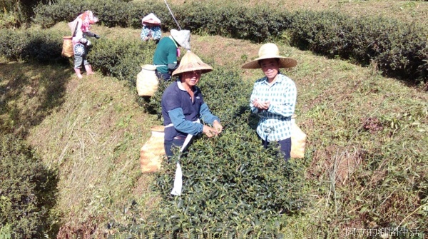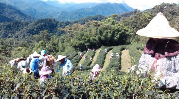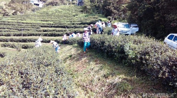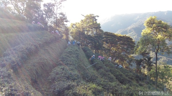 稍稍走進茶園,這才看清楚到已經有一群人在茶園下方工作,兩人一組緩步水平移動,接著往上一層,由下往上採,採到茶園頂表示已經採完。