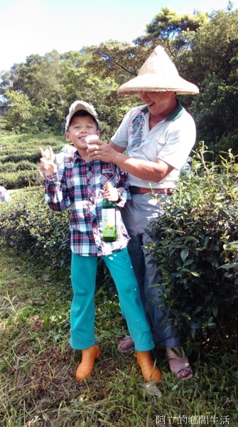 這時出現了一位提茶小弟,提著小茶壺和茶杯,一一奉茶給採茶人,真是體貼。