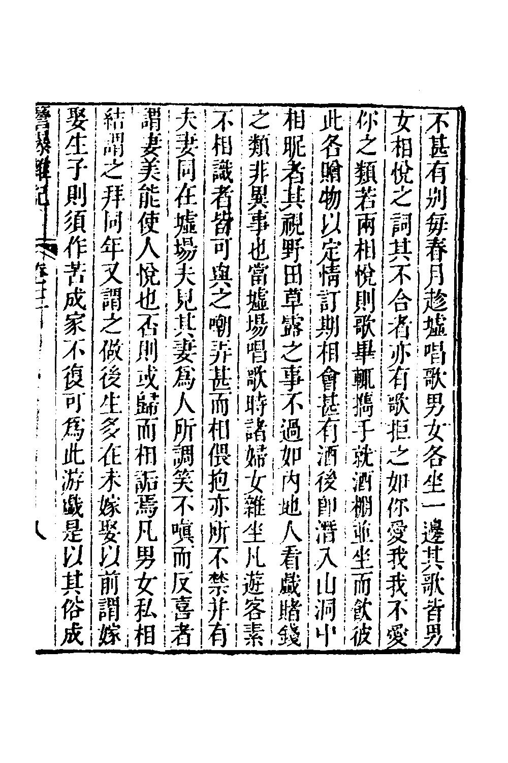 清朝趙翼在他的檐曝雜記的邊郡風俗篇裏有記載"粵西土民及滇、黔苗、倮風俗,大概皆淳樸,惟男女之事不甚有別.每春月趁墟唱歌,男女各坐一邊,其歌皆男女相悅之詞.其不合者,亦有歌拒之,如”你愛我,我不愛你”之類.若兩相悅,則歌畢輒擕手就酒棚,並坐而飲,彼此各贈物以定情,訂期相會,甚有酒後即潛入山洞中相昵者.其視野田草露之事,不過如內地人看戲賭錢之類,非異事也.當墟場唱歌時,諸婦女雜坐..."