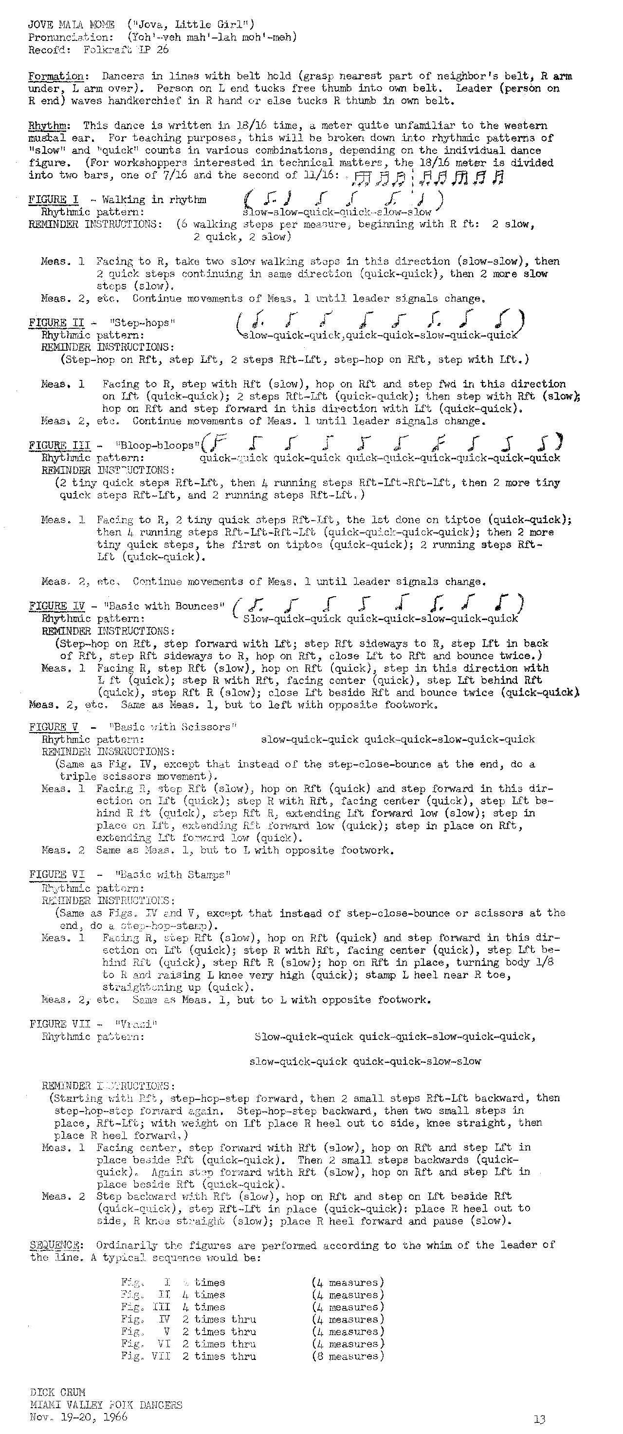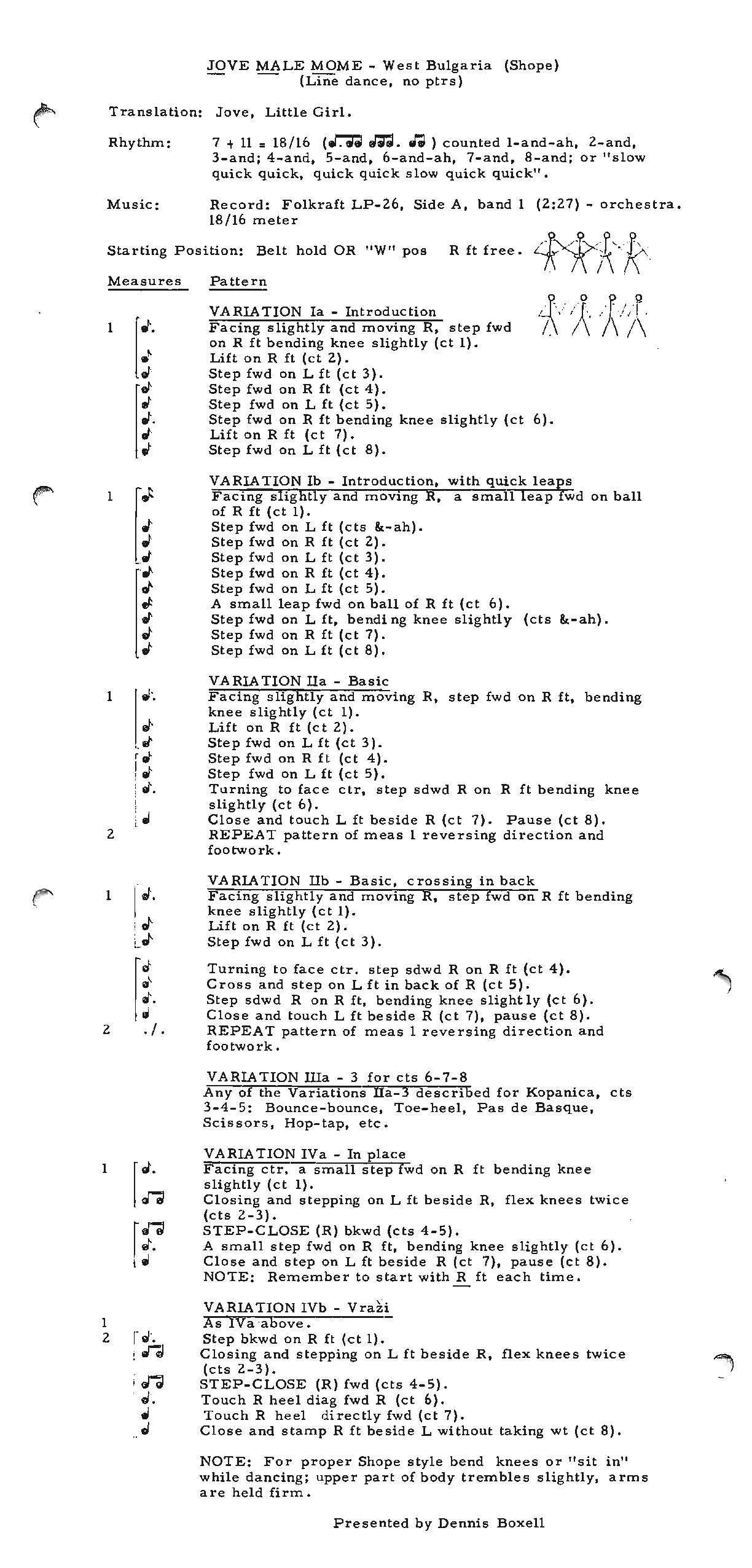 接下來介紹舞蹈的部分.音樂已經是如此的複雜,舞蹈也單純不到哪裡去,就青蛙老師所知,當初推廣來少女約葳舞蹈的起碼有4位老師,3種版本.本舞最早推廣的應該是西元1966年在美國世界土風舞營的Dennis Boxell.之後還有Yves Moreau,Dick Crum,Jaap Leegwater等總共4位老師.舞蹈版本,依照地區的不同,有Nis版,有Godec版….跟我們現在跳的版本又不一樣!!光是舞名就很分歧,有好幾種名字,Yove male mome,Jove male mome,Jove malaj mome,Jove mala mome…..等等對的不對的好多個.以西元1966年第一次在美國Stockton世界舞蹈營手冊中的寫法是 Jove male mome;可是傳出來之後,美國舞友可能因為發音的關係,誤寫成Yove male mome.就這樣錯了50多年.依照Šopluk地方的語言來說,Jove,Malaj Mome為正確的拼法,因此請舞友們記住這首舞的正確名稱.