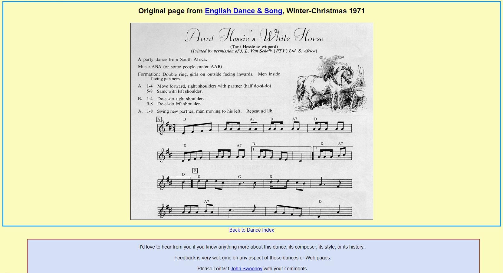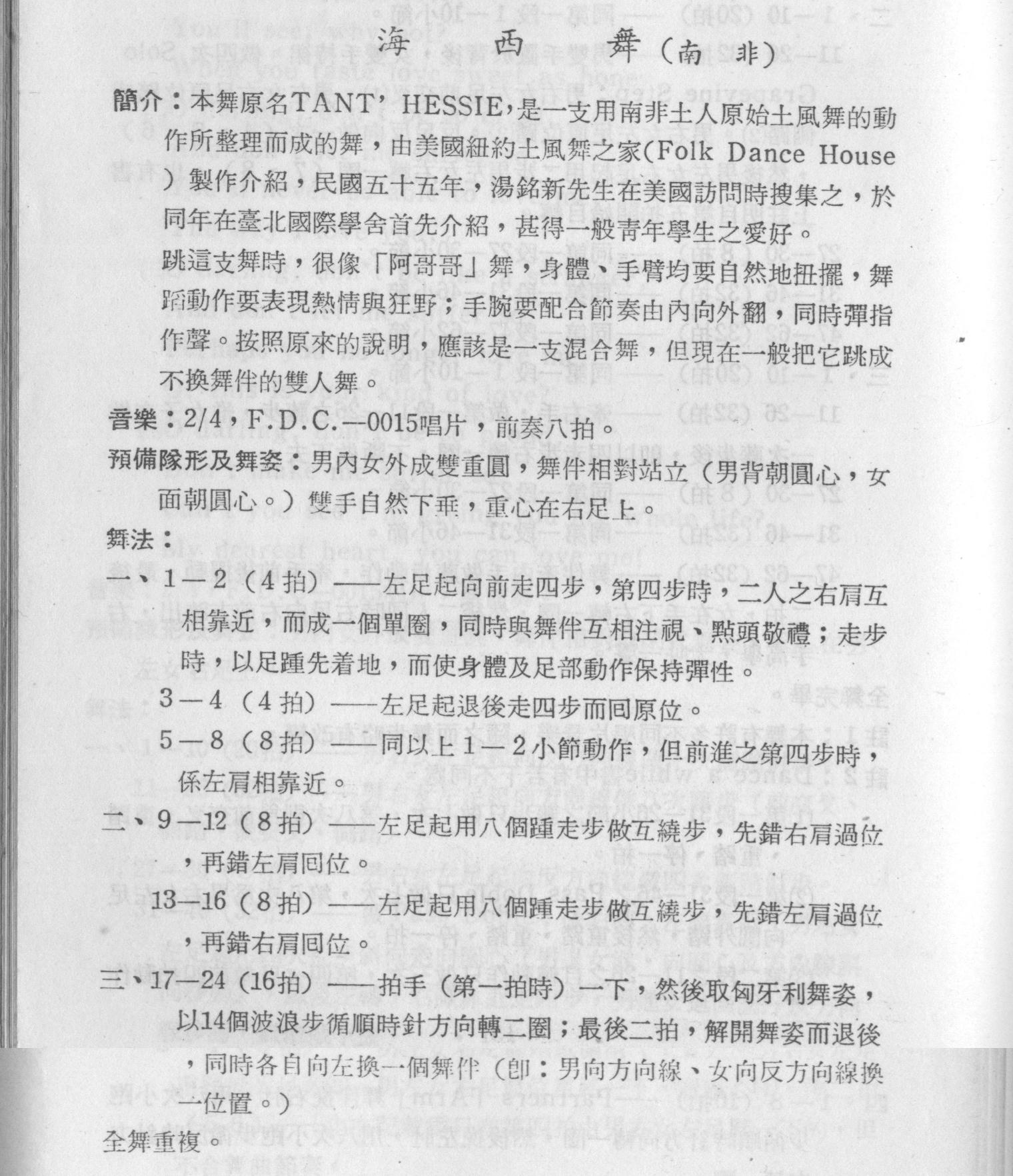青蛙老師分析,前面有提到南非從西元1806年到1961年5月底共和國建立為止,英國人總共在南非統治了155年.在這155年之間,來自英國,甚至歐洲各國的移民肯定帶來不少原宗主國的文化與娛樂.這首海西舞就不無可能是從英國帶過來的民間舞蹈嘍.猜測歸猜測,總是要有文獻證據來佐證.於是青蛙老師找到了一本有關於英國舞蹈季刊雜誌English Dance & Song Magazine.這本雜誌的西元1971年冬季號中,就有介紹這一首Tant' Hessie.不但有舞法,連樂譜都有,並且介紹這一首舞是屬於舞會遊戲(Party Dance),從南非來的.