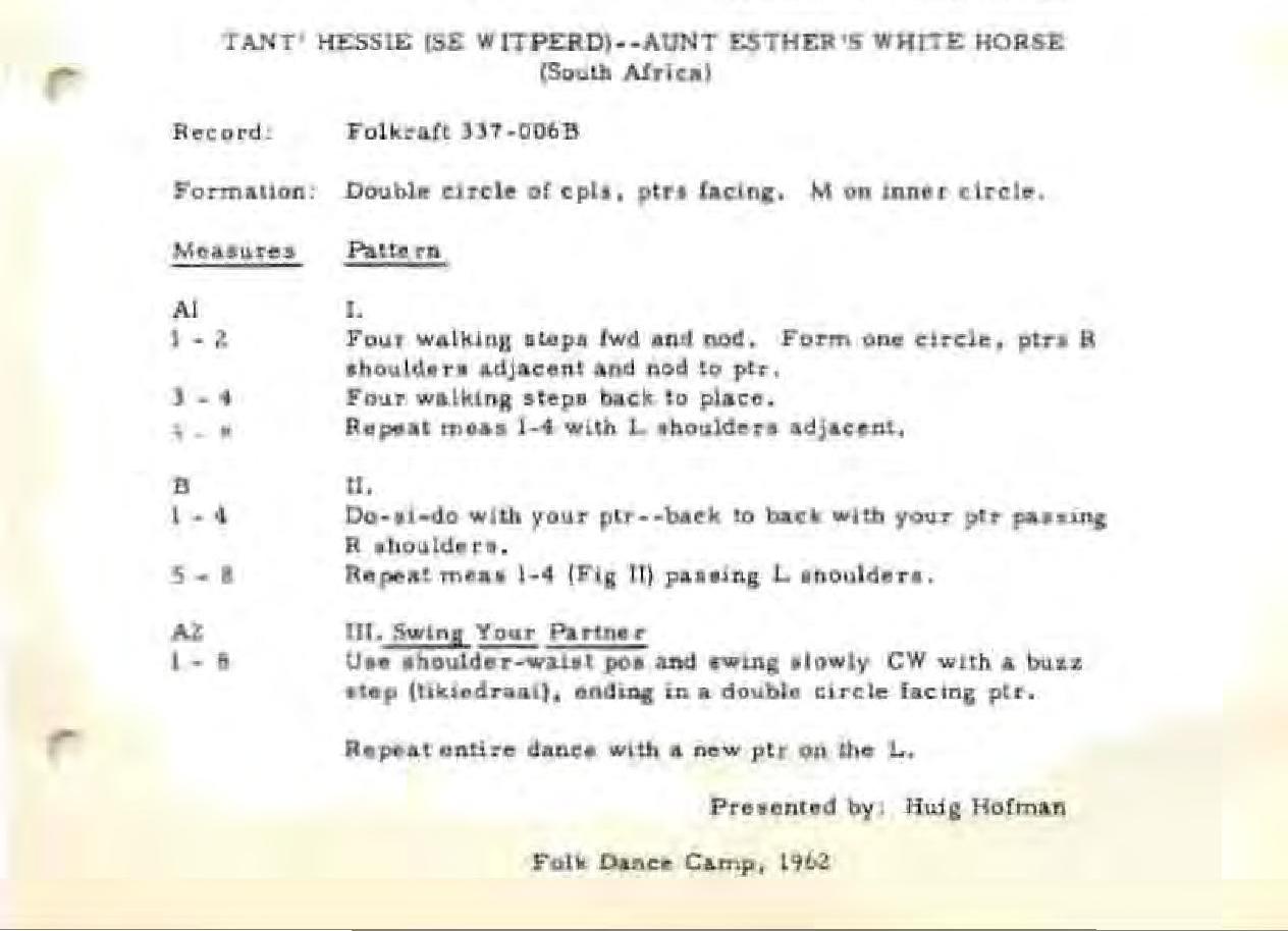 既然這本雜誌是英國舞蹈專書,怎麼會出現一首掛名為南非的舞蹈呢?是否與英國有相當的關連呢?這的確留給研究者多了一點想像空間.除了英國舞蹈雜誌的資料之外,我們再多看一個:編舞者.本舞由比利時Huig Hofman老師所重建,而Huig Hofman老師從西元1951年開始就出版土風舞的書,他的研究範圍涵蓋各種舞會遊戲舞蹈,包括資深舞友們跳過的加拿大穀倉舞,荷里皮波….等等都是Huig Hofman老師編的舞, Huig Hofman也同時獲得比利時政府與荷蘭政府頒勳章表揚過,並於西元1962年開始到美國教土風舞.如果再加上編舞老師的背景,青蛙老師可以大膽的判斷:音樂雖然取材自南非童謠,但舞蹈本身實乃英國在南非殖民時期舞會遊戲的一種,由精通舞會遊戲舞蹈的Huig Hofman老師重建回來.