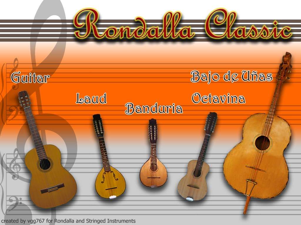 本舞音樂中最主要使用的樂器叫做Rondalla.Rondalla是菲律賓的傳統撥弦樂器家族,從高音琴到低音琴一系列.
