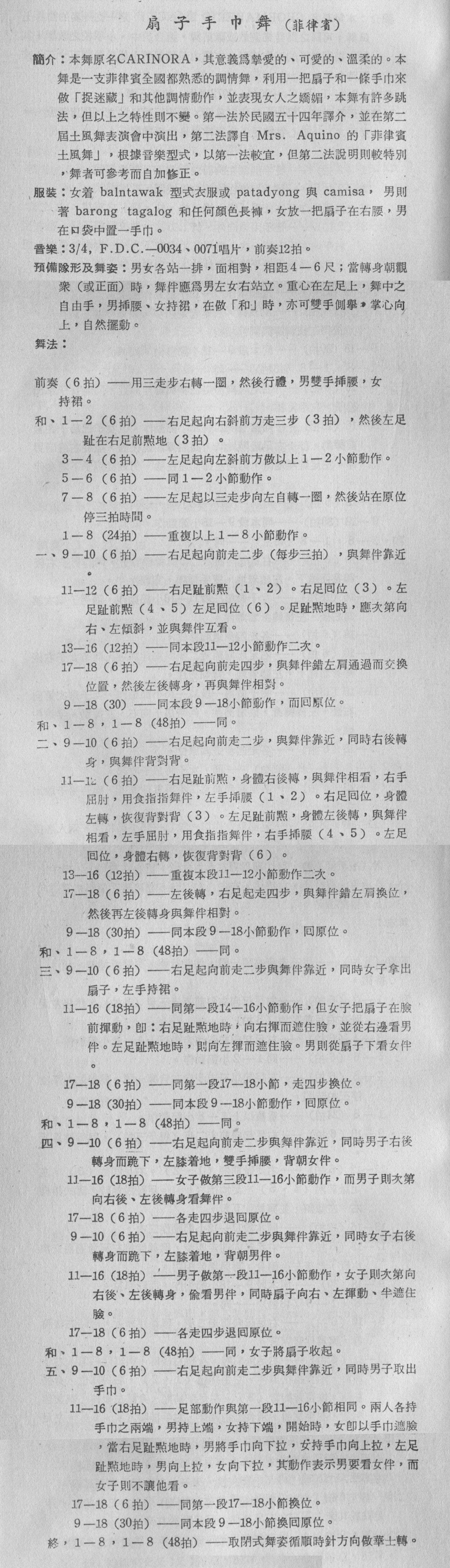 在台灣,扇子手巾舞是在民國54年譯介進來的,並在第二屆土風舞表演會中演出.