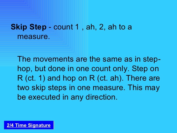 Skip跑跳步:3/4+1/4不均等步:重心腳踏地(3/4拍),另足屈膝離地(1/4拍).