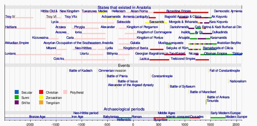 歷史上更不用說,這個歐亞走廊經過多少種族的來來往往,或是駐足,或是定居或是建國,族繁不及備載.例如新石器時代古安納托利亞人就居住在此.後來,西臺人在安納托利亞半島建立起西臺帝國(西元前18世紀至西元前13世紀),亞述人在土耳其南部建立亞述帝國(西元前1950年一直持續至西元前612年),到西元前四世紀,馬其頓王國的亞歷山大大帝征服此地,甚至後來在我們唐朝時期被唐太宗打敗的東突厥(拜唐太宗為”天可汗”),以及被唐高宗打敗的西突厥也都跑到這裡來安身立命.到西元13世紀,鄂圖曼的崛起,在中世紀末建立強大的鄂圖曼土耳其帝國.