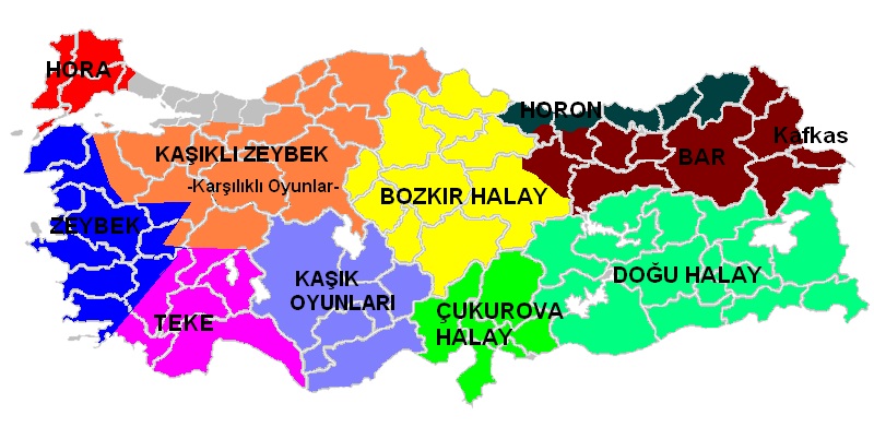 回頭看土耳其國內的部份,土耳其的東部,幾乎快要半個土耳其的國土都被Halay舞所占領.就因為流傳地區廣大,所以不論節奏,樂器,音樂,舞蹈結構樣式相當多,後面再慢慢分析,先看看在土耳其境內Halay的分佈.Halay在廣大的土耳其國土中因地域的關係分成三大塊: