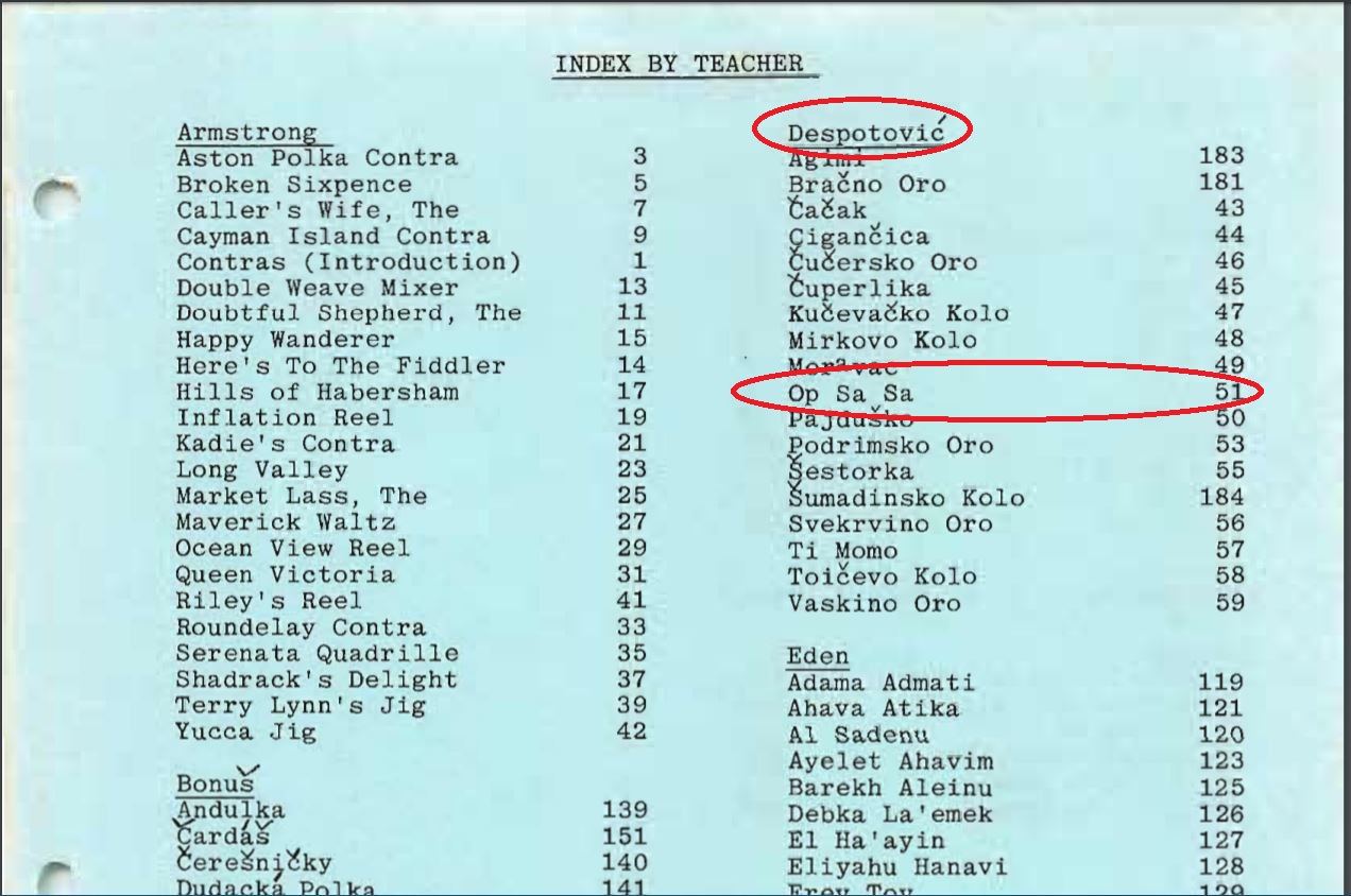 本舞由Miodrag "Ciga" Despotović,於西元1979年在美國太平洋大學(7/22日~8/4日)的世界舞蹈營和聖地牙哥大學(8/12日~8/19日)舞蹈營(San Diego State University Folk Dance Conference )中介紹.這一年後辦的聖地牙哥大學舞蹈營重量級的大師雲集,除了Ciga老師之外,還有張慶三老師與陳芳枝老師也應邀教授中國舞蹈,波蘭的Ada老師,土耳其舞的勃拉老師...等等大師.(感謝陳芳枝老師提供資訊)