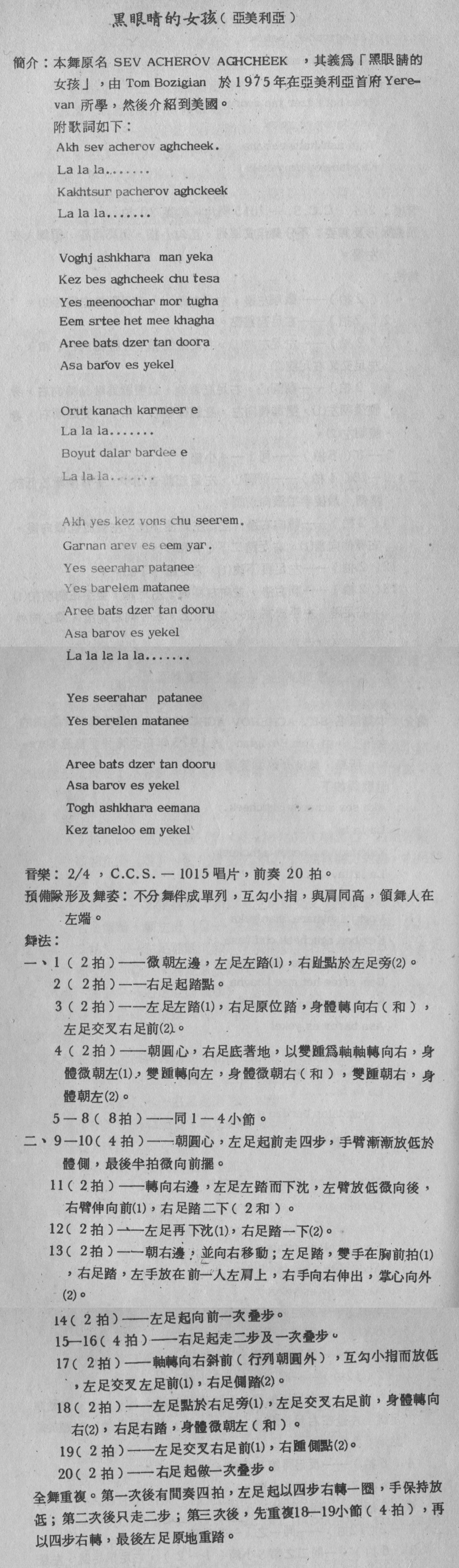 前些年在網路上找到一些資料研讀之後,再看了網路上國外社團跳的舞法,才赫然發現,原來我們跳了幾十年的黑眼睛的女孩,第二段第2小節的8拍動作與原舞有誤!