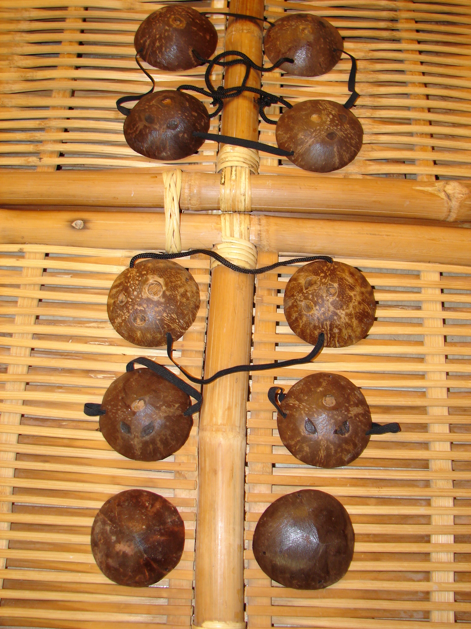 既然舞名叫做椰子殼之戰,那麼椰子殼當然是少不了的道具嘍.將曬乾的椰子殼剖成兩半,用繩子固定在身上幾個地方:膝蓋,胸前,後肩以及兩腰各別上2個椰子殼,加上兩隻手各拿一個,總共需要10個.菲律賓文稱這些椰子殼為bao,也就是本舞另外一個舞名Magbabao的字尾.