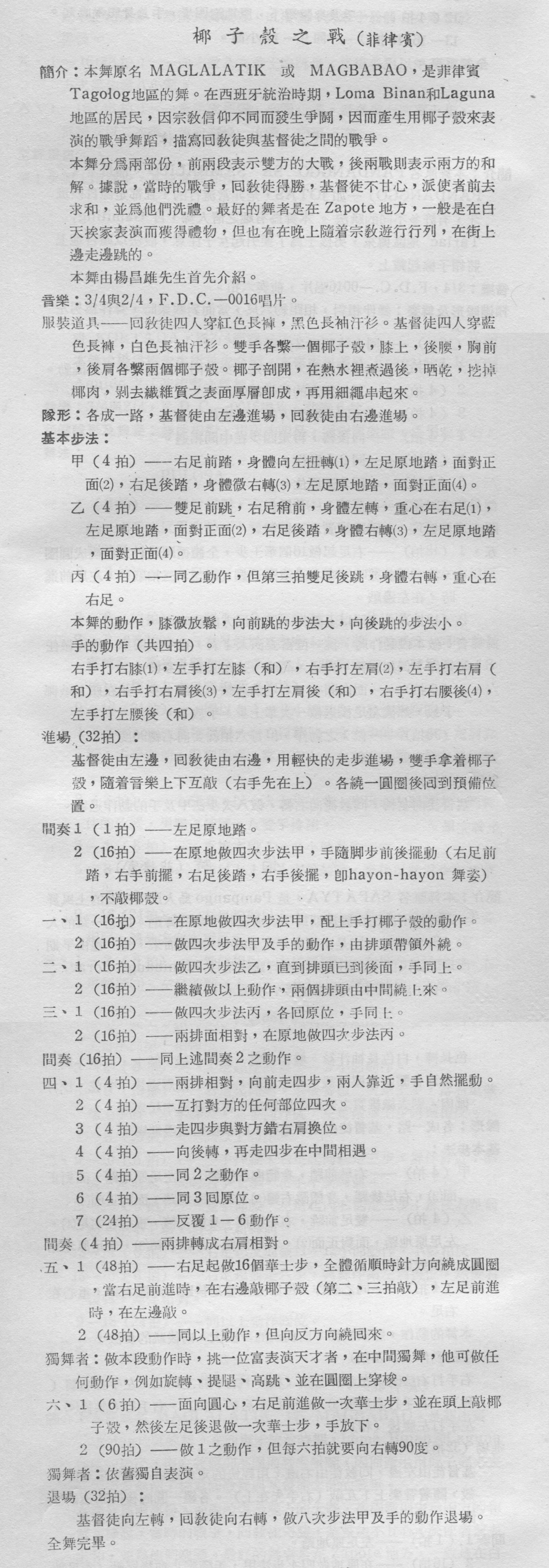 PS:熟悉青蛙老師的人可能會發覺到,青蛙老師在編舞時非常喜歡使用道具,上面台北大學司法系椰子殼之戰的椰子殼是青蛙老師跑了好幾個水果店才湊齊了40顆香水椰子,大家把椰子水喝完之後,將椰子殼剖半,曬乾三天,再用電鑽鑽孔,用亮光漆上漆,再晾乾,再用繩子串綁起來.因此跳這首舞不只是單單練舞而已,還有香甜的椰子水可以喝,還可以享受做道具DIY的樂趣,一舉數得.跳土風舞就應該如此的歡樂.