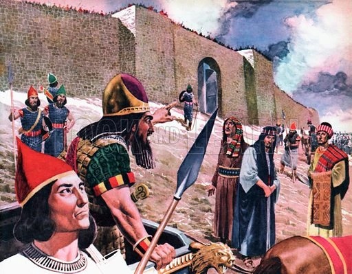 攻下了拉吉之後,最後的目標就是猶大國都耶路薩冷.亞述軍隊的殘忍是眾所周知的,此時耶路薩冷的居民全部都剉嘞等.當亞述的戰車,戰馬與精銳士兵兵臨城下時,猶大國王希西嘉派出了三位大臣出城,在城門下與亞述的將軍談判.想也知道,兩邊的條件絕對談不攏,大家各自回家準備打仗吧.