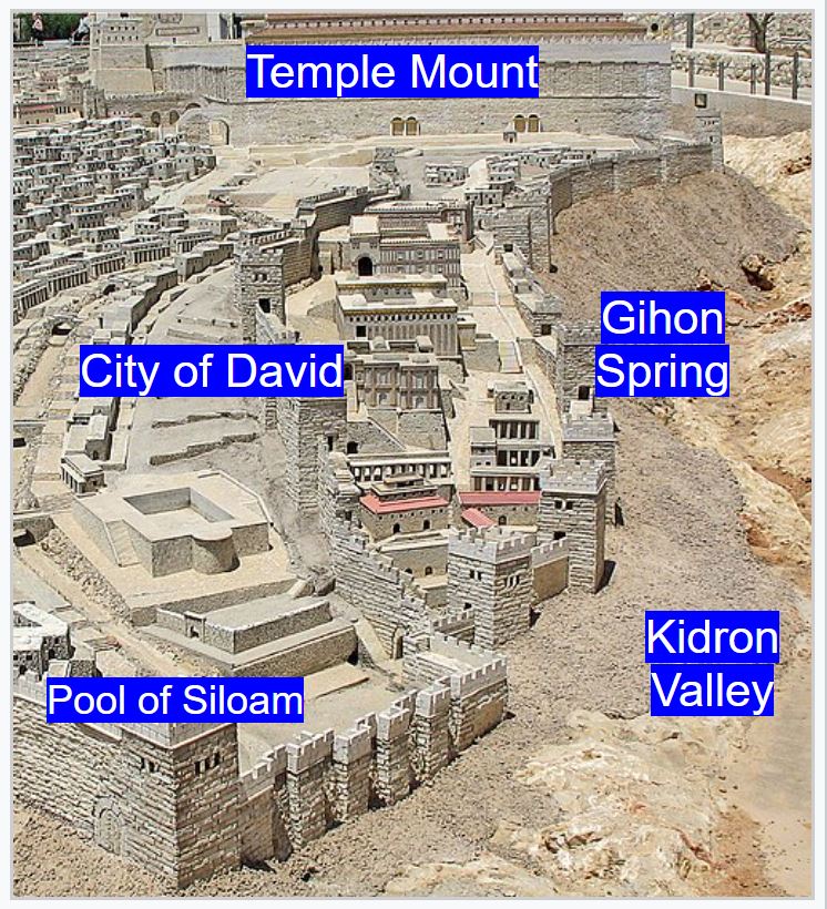 希西嘉水道(Hezekiah tunnel):1為基訓泉;4城西貯水池: