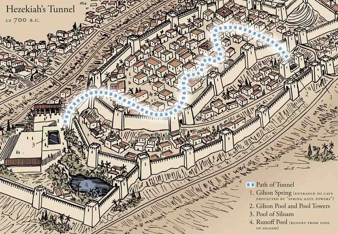 後來幾經思考,如果亞述人再來侵略,外城門的基訓泉防護還是太脆弱,很快就會被破壞掉,耶路撒冷的人民與國王一樣憂心忡忡:”亞述王怎麼會來,卻得著充足的水呢?”(歷代誌下32:5).應該想一個更周全的辦法來保全水源.於是一個在當時西元前七,八世紀算得上是瘋狂的想法產生了:將外池的池水用隧道引流到城內的另一處,也就是西邊貯存.於是希西嘉國王下令隧道從兩邊同時開挖,縮短工期.同時也將隧道的入口做隱藏,讓敵人找不到,無從破壞.(後來這條水道就被稱為希西嘉水道(Hezekiah tunnel))