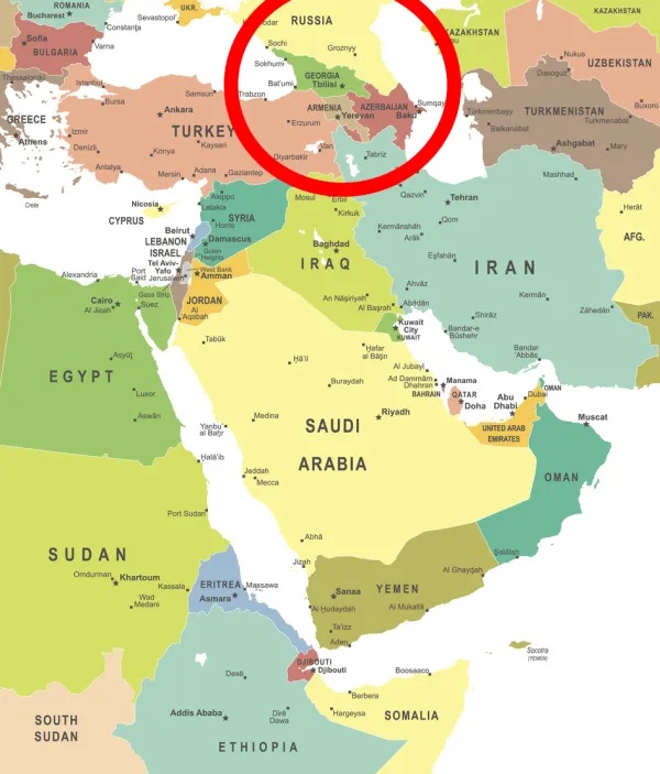 高加索山區鄰近國家:(主要為亞美尼亞,喬治亞與亞塞拜然等三個國家,土耳其只有東北部的Artvin省有沾到一點點)