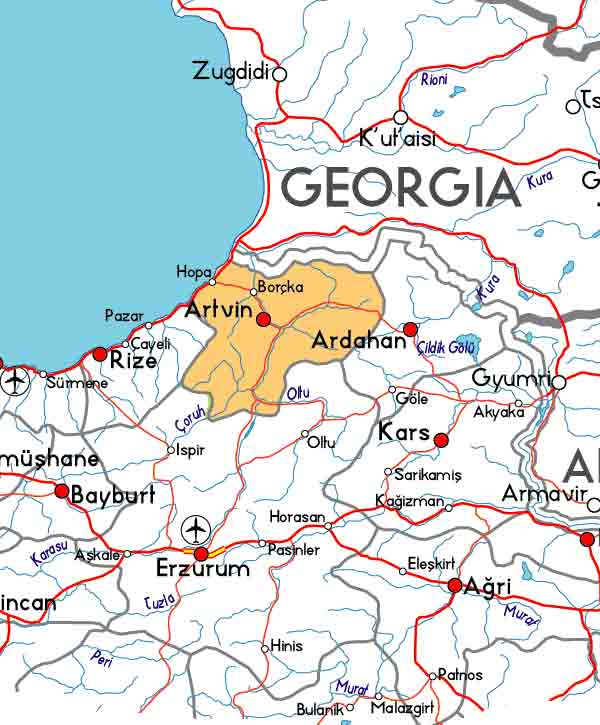 土耳其東北部的Artvin省與鄰近各國地圖:(紅色為其省會,也叫Artvin)