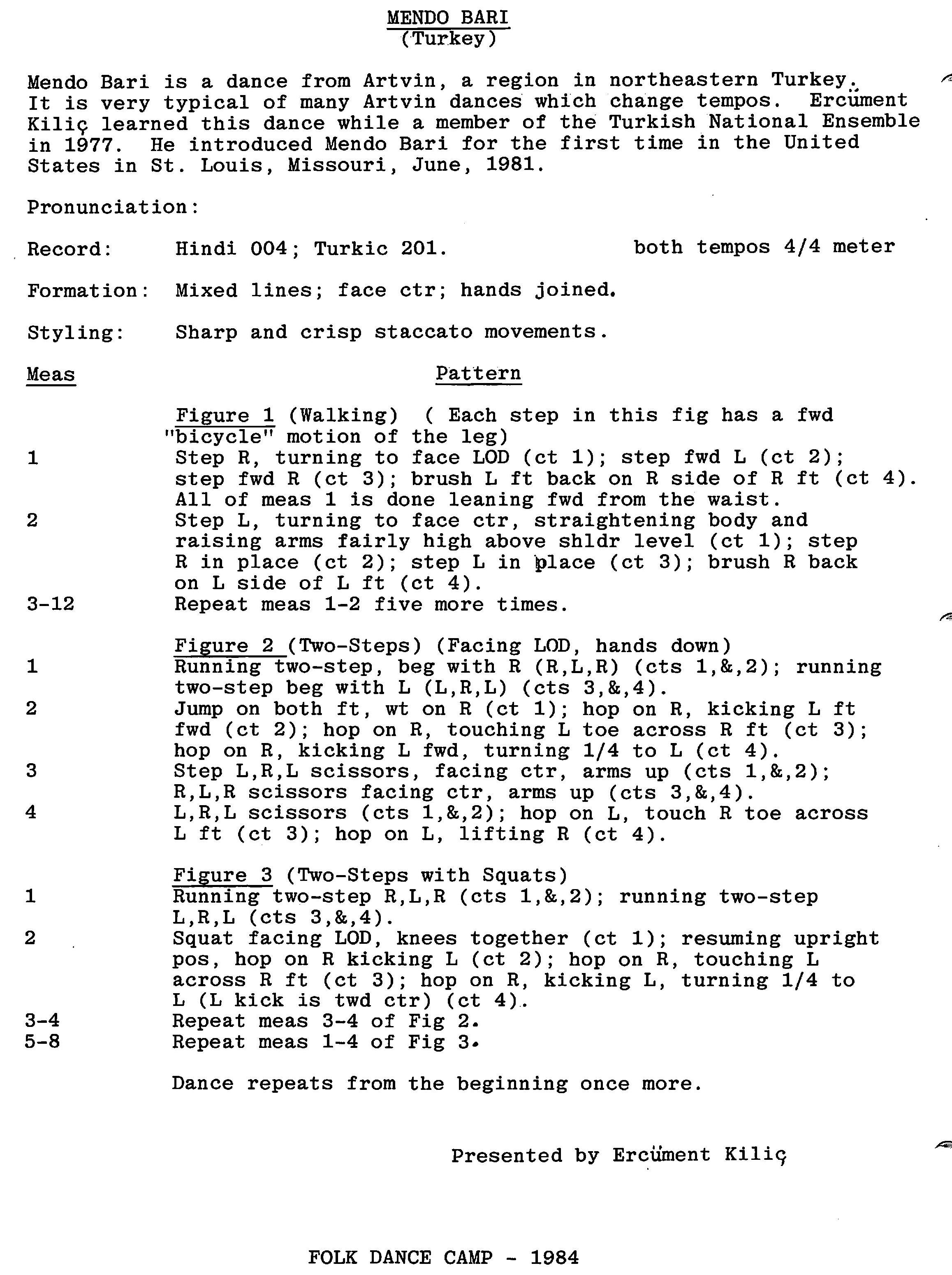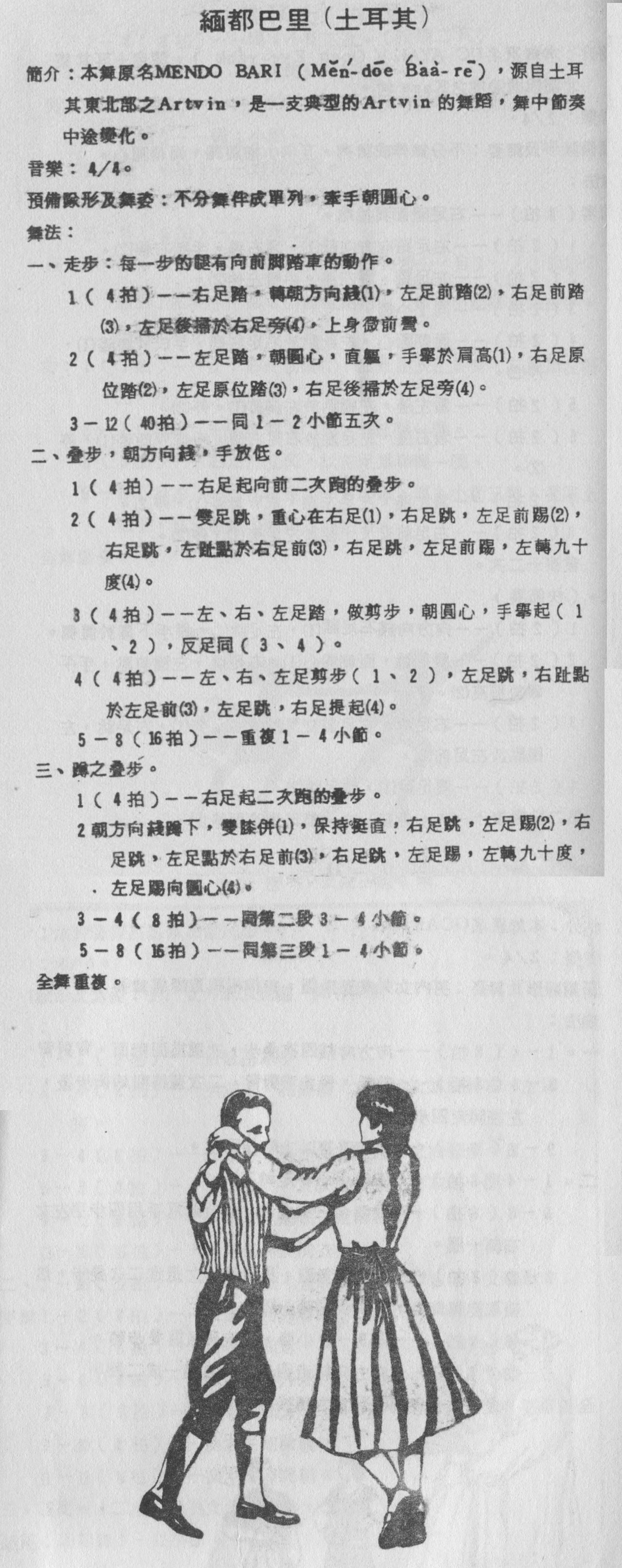 本舞名土耳其原文為Mendo Barı.音譯Mendo Bari.Mendo是土耳其的男子名,相傳這首舞是一位名叫做Mendo的男子所編.Mendo編這一首舞時,以緩慢的慢板開始,中間突然速度加快,全舞就在這樣快慢切換之中行進.行進的路線沒有特別限定,可以是多方向的弧形.主要是男子的舞蹈,有時候也可以男女混合跳.後來本舞主要是在婚禮中來跳,展現個人特色與提高結婚場合氣氛.