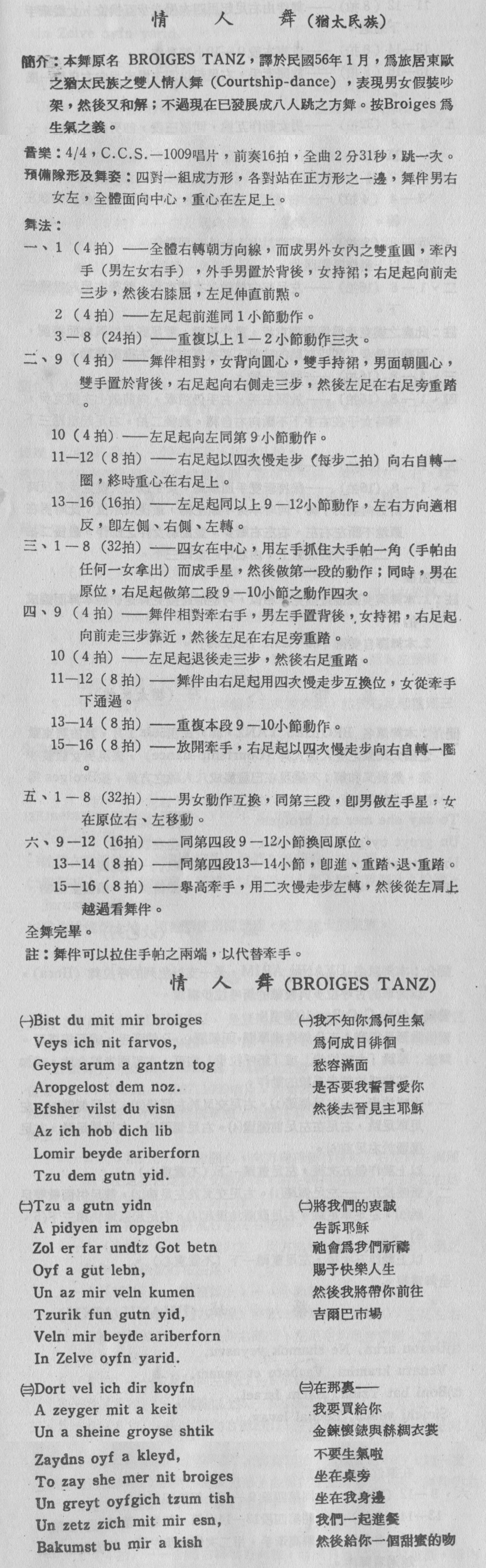 PS:眼尖的舞友們應該發現到,上面青蛙老師貼的弦歌唱片第1009集的背面只有11首歌的歌詞,獨漏這一首猶太情人舞的歌詞.不知道是不是意第緒語太難還是怎麼樣,別說民國60幾年的弦歌唱片上沒有這一首歌的歌詞,就算到現在網路上,青蛙老師也沒有找到意第緒語的原始歌詞,不過音譯歌詞倒是所在多有,當年張慶三老師就已經收錄在土風舞世界全集續篇中,青蛙老師直接引用,省事很多.呵呵~