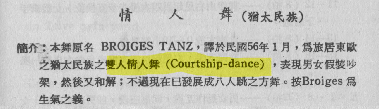 中文翻譯舞序把court-dance翻譯成雙人情人舞更是奇怪.首先court-dance如前所述,是叫做求偶舞,不是情人舞.再者,英文舞蹈名詞裏面似乎沒有”情人舞”的專有名詞.比較接近的是couple dance,雙人舞,但這是一男一女一起跳的舞,不見得是情侶.可是不論中外確實都存在有情人舞呀,隨便舉個例子,以色列多地利,葡萄成熟時…等等不都是情人舞嗎?那怎麼沒有”情人舞”這個分類呢?這的確是個好問題,青蛙老師以前也沒有想到過,這就留給舞友們繼續研究下去吧.