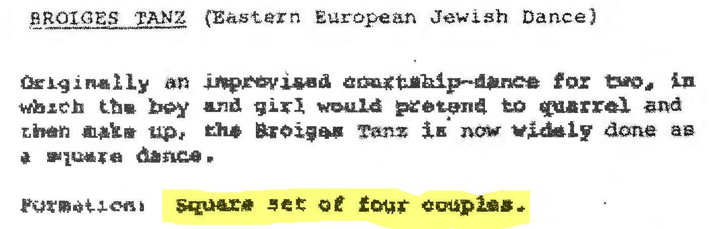 我們回頭來說說本舞如果不列在求偶舞,那這首舞應該歸類在什麼類型的舞蹈呢?前面介紹過,這首舞是流行在東歐的意第緒語區猶太人婚禮上的舞蹈,通常是由婆婆跟丈母娘兩人來扮演的即興舞蹈,青蛙老師認為這首舞偏向儀式舞蹈,因此將本舞列在儀式舞蹈類別應該可以.儀式舞蹈的專有名詞是Ritual Dance,意思是在儀式中進行的舞蹈,例如宗教儀式,慶典或特殊活動中的舞蹈,像我們跳過的印地安祈雨舞,水舞,農家樂…等等.這首猶太情人舞是在婚禮中跳的特定舞蹈,這就符合”慶典或特殊活動中的舞蹈”的定義,因此,青蛙老師會將本舞列為儀式舞蹈,而不是中文舞序中說的情人舞,更不是原文舞序中說的求偶舞了.