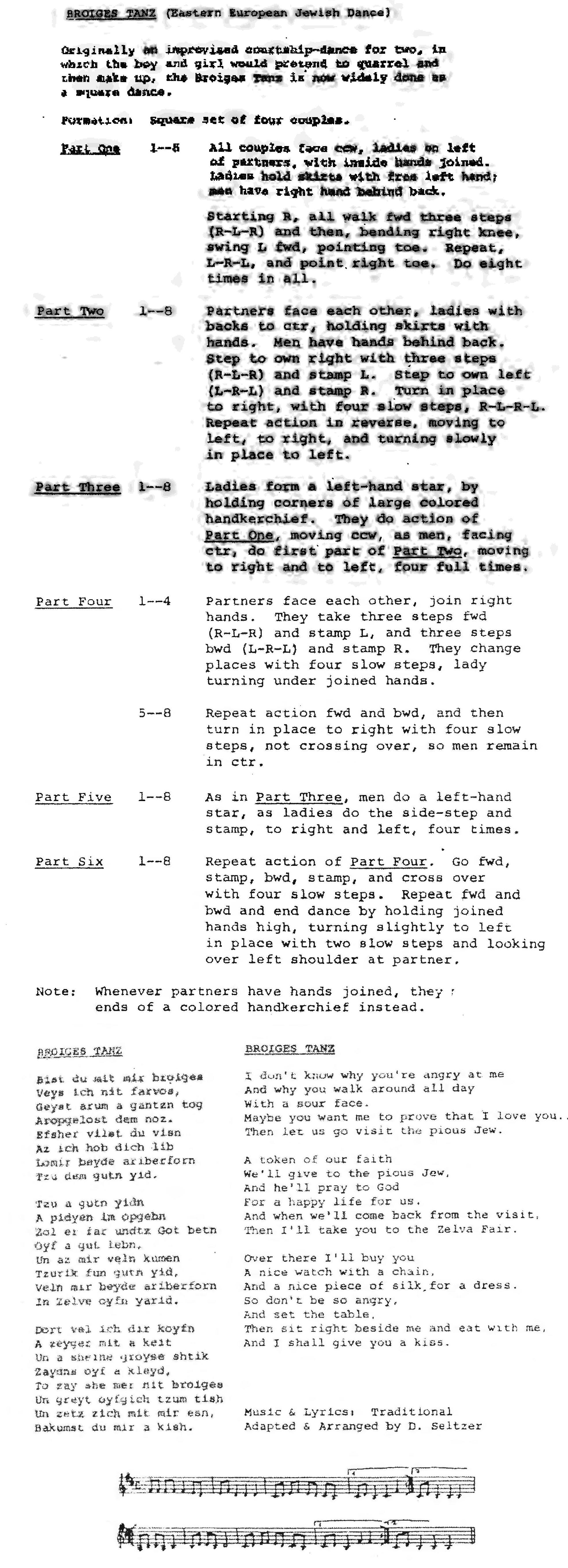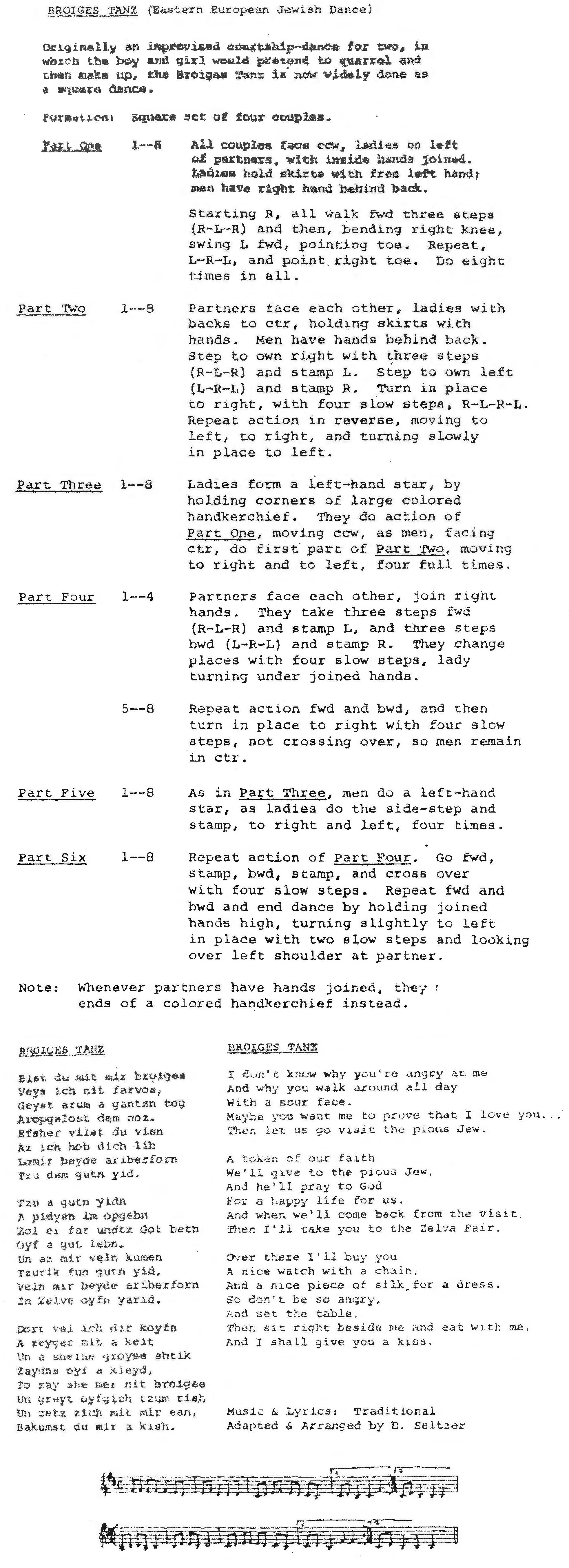 這是一首非常傳統的猶太傳統文化習俗與舞蹈.舞名Broiges Tanz是意第緒語的羅馬拼音.Broiges也有拚成Broyges或Broygez的,等於英文裏的anger,意思是生氣;Tanz意思是舞蹈,合起來就是”生氣之舞”啦.