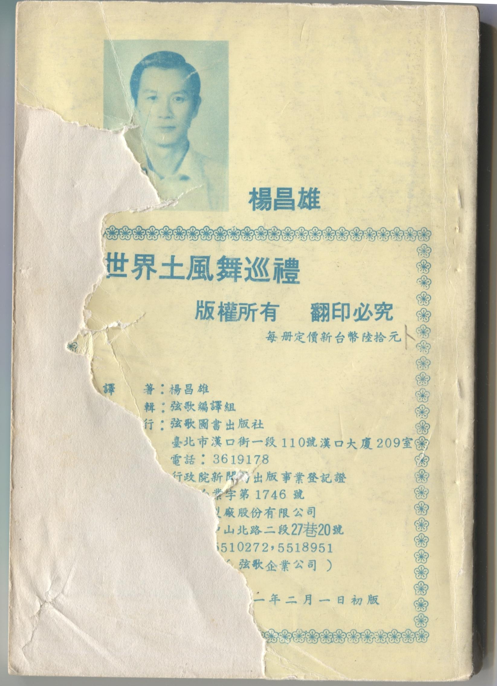 世界土風舞巡禮_封底:(青蛙老師沒有保存好,有一點破損,還好沒有損傷到楊昌雄老師帥帥的照片)
