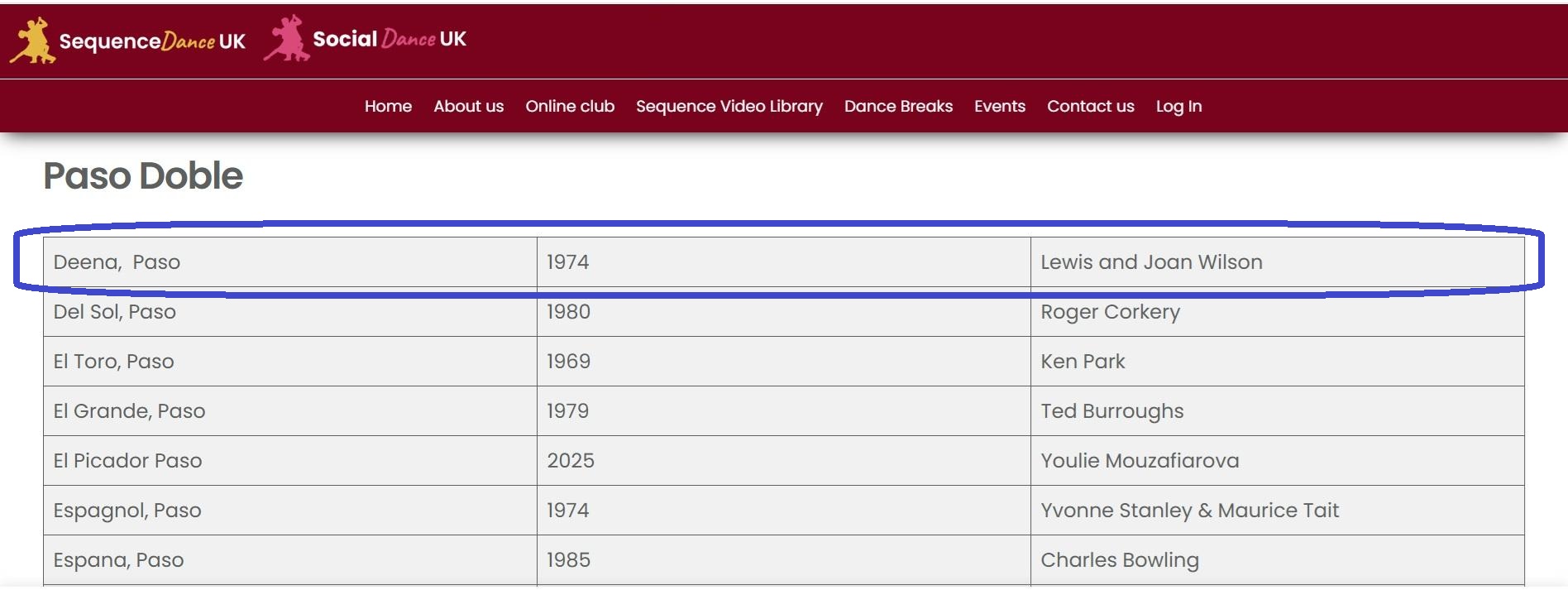 英國序列舞老師Lewis 與Joan Wilson夫婦於西元1974年編了一首舞名叫做Paso Deena的paso doble,楊昌雄老師應該是從Lewis老師的這一版Paso Deena為藍本做延伸(青蛙老師猜的,雖不中,亦不遠矣).