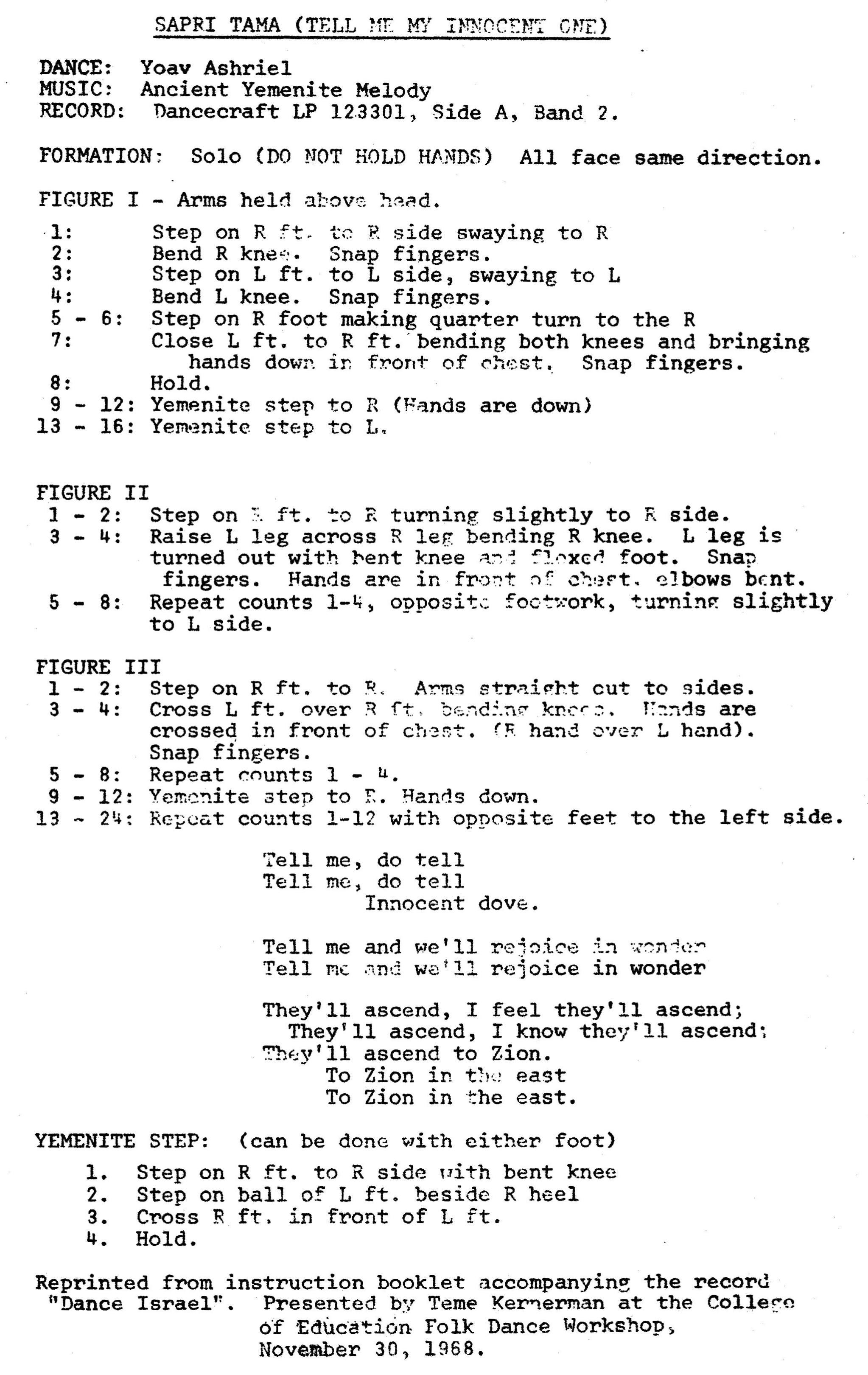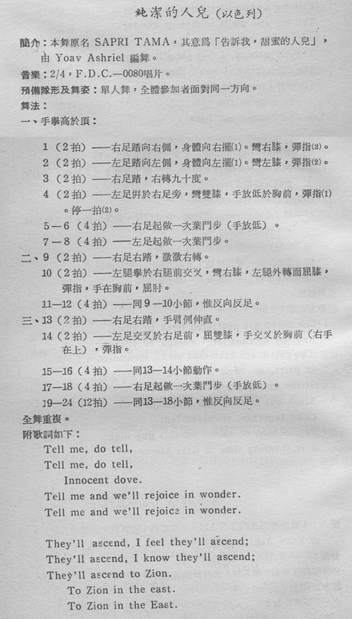 接下來我們來講講舞名,也就是歌名,的意思.這也是青蛙老師從高一學這一首舞之後一直不解的問題.當年我們的資料都是從美國來的,透過國內的老師翻譯成中文.這一首舞的舞名英文通常將希伯來文意思翻譯成Tell, innocent one.我們中文翻譯為告訴我,天真純潔的.從上面張慶三老師的土風舞世界全集的簡介中,我們看到早一輩的老師翻譯為”告訴我,甜蜜的人兒”.但是青蛙老師怎麼就覺得有點矮優矮優(閩南語發音,很難用文字或注音拼出來,意思是彆扭的意思).