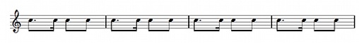Habanera基本節奏2/4拍子,組成為:附點八分音符、十六分音符、八分音符、八分音符,樂譜示意如下: